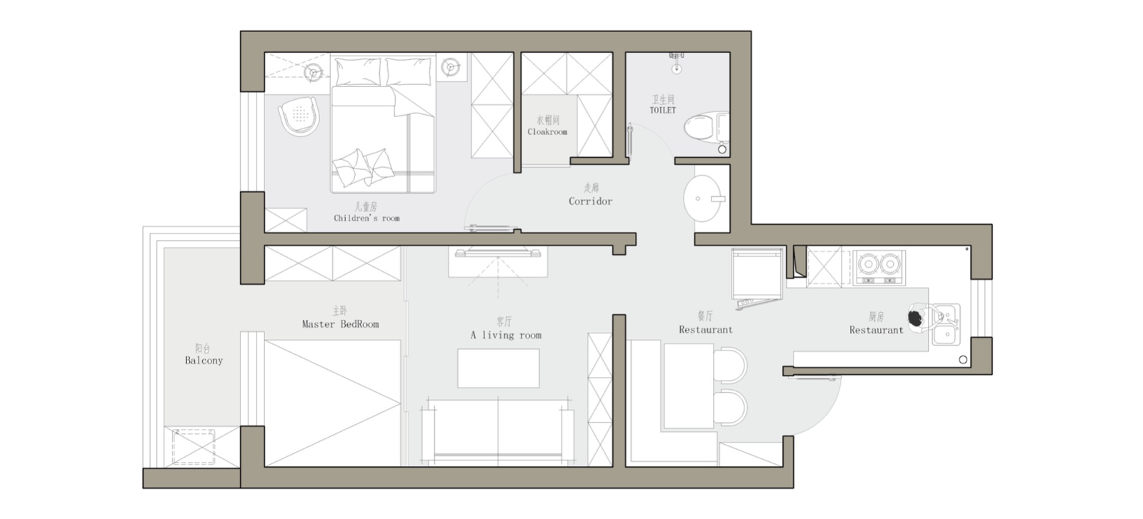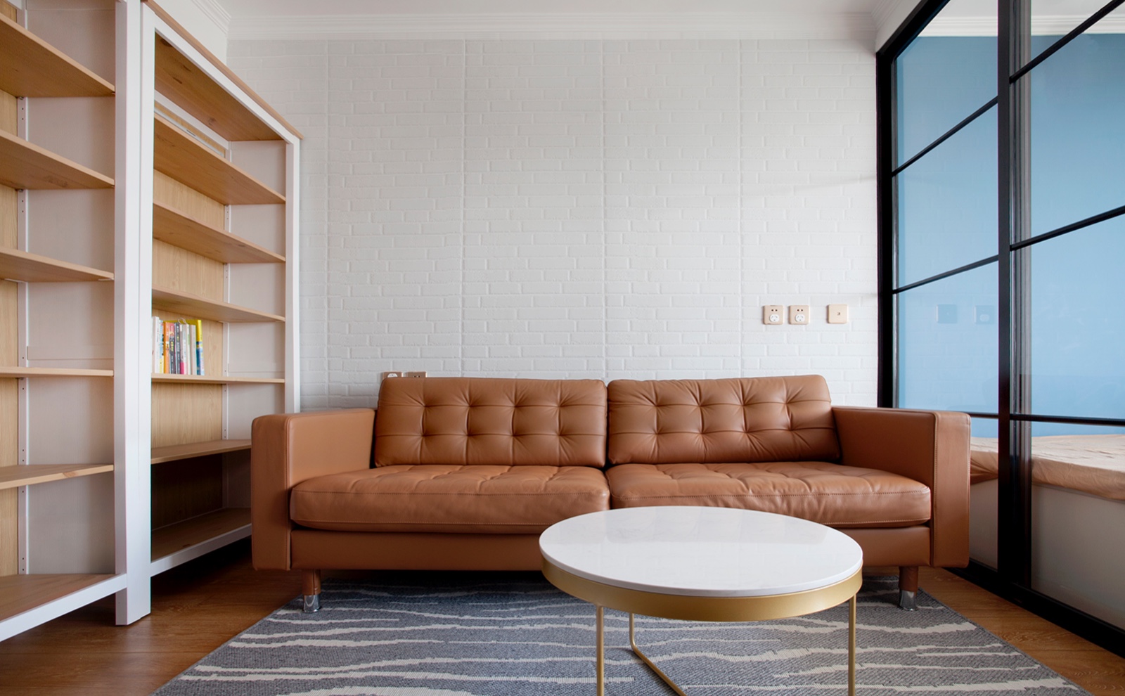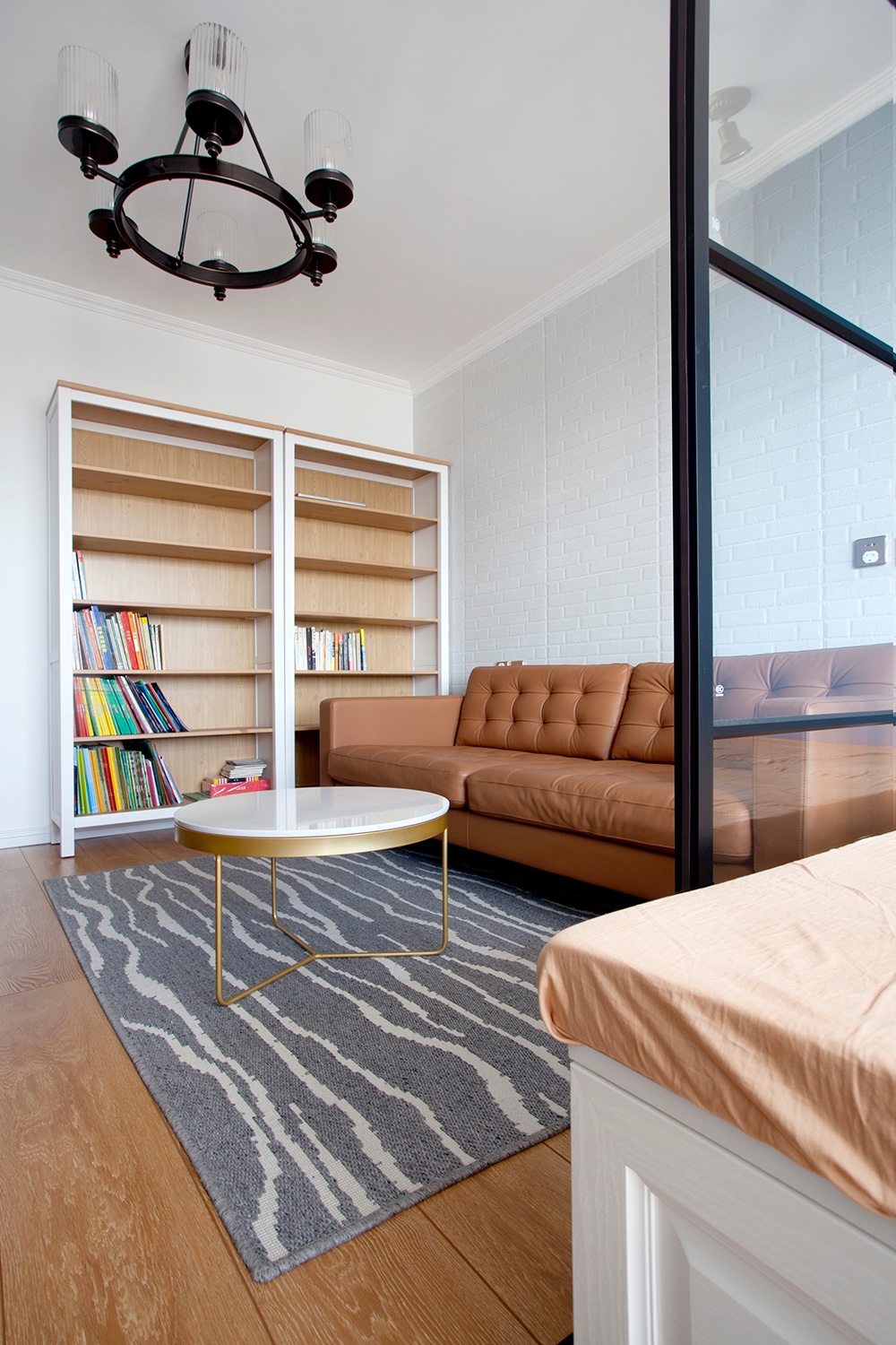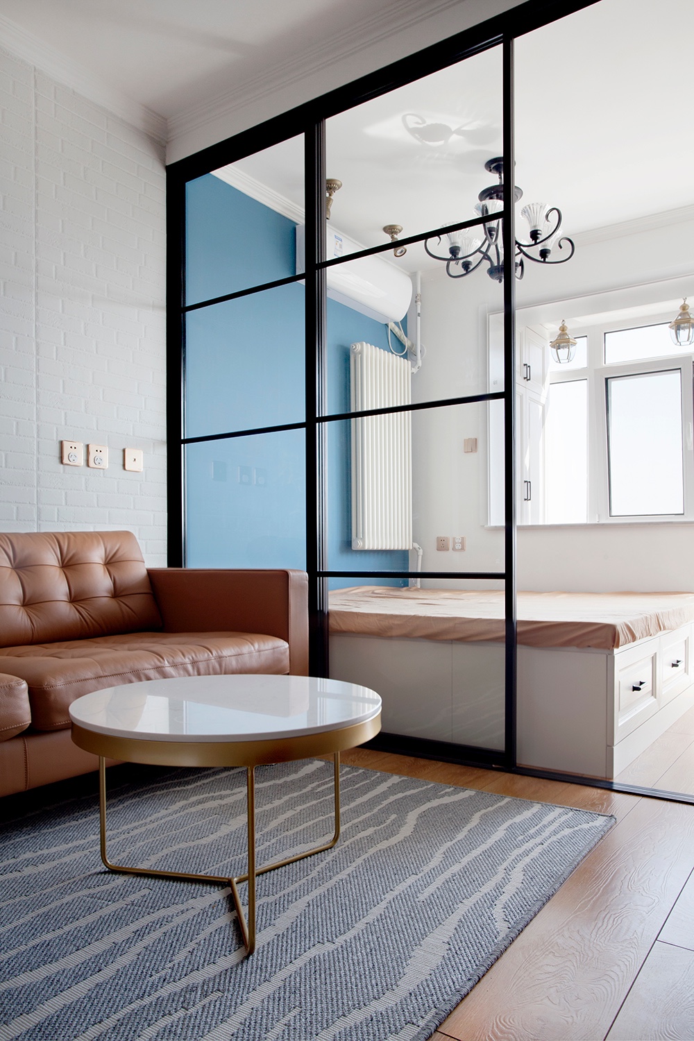 把原來(lái)的客廳分割成一個(gè)臥室和客廳,中間用玻璃推拉門來(lái)改善采光問(wèn)題。