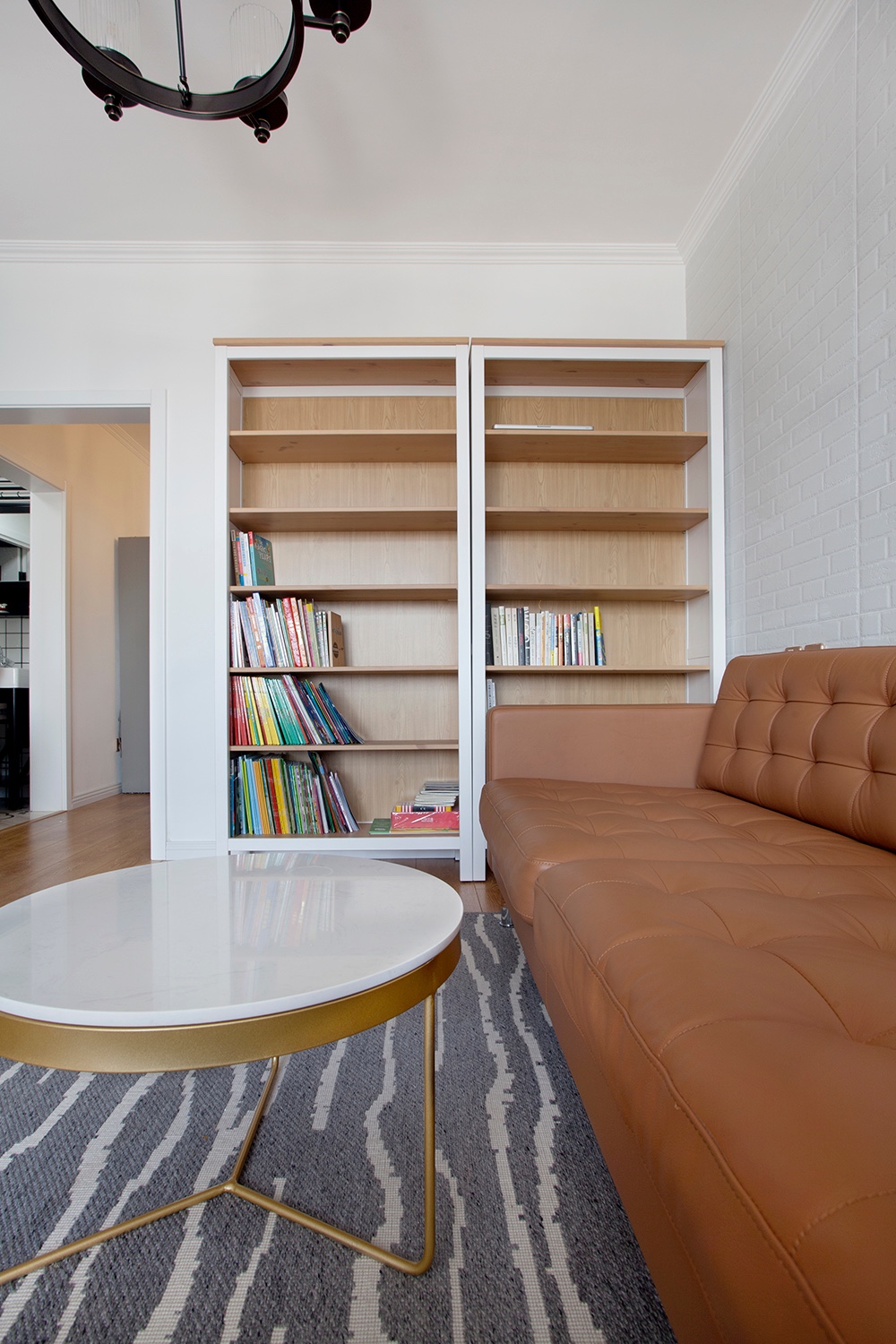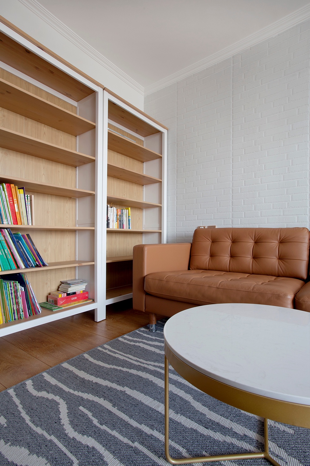 業(yè)主書籍比較多,在沙發(fā)側(cè)墻安排一個(gè)大的書架,放一些書籍和工藝品獎(jiǎng)杯之類的。
