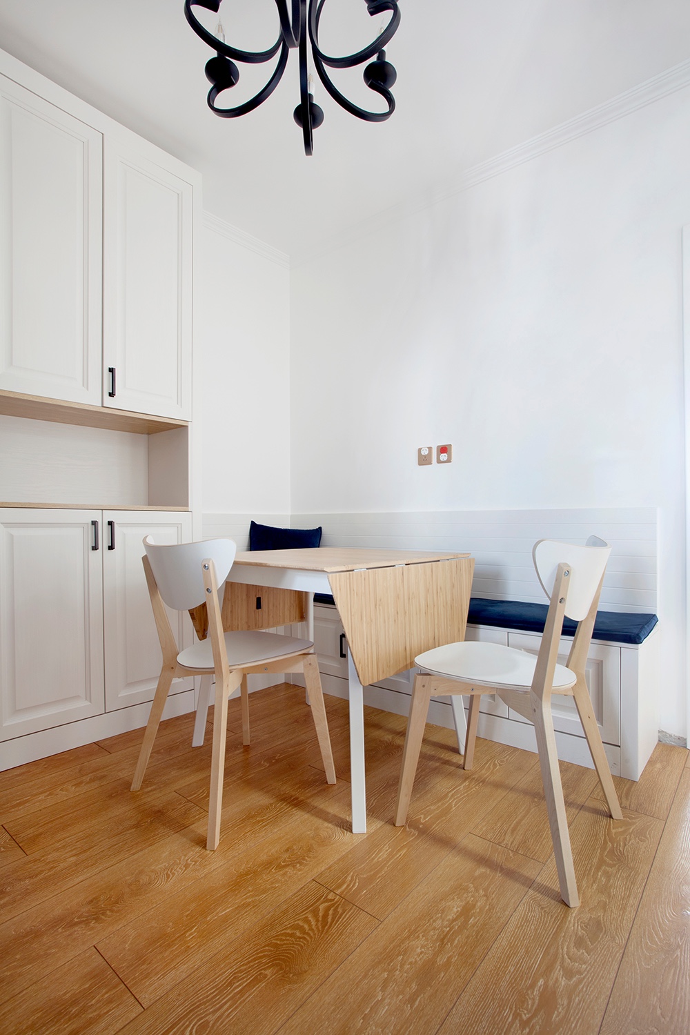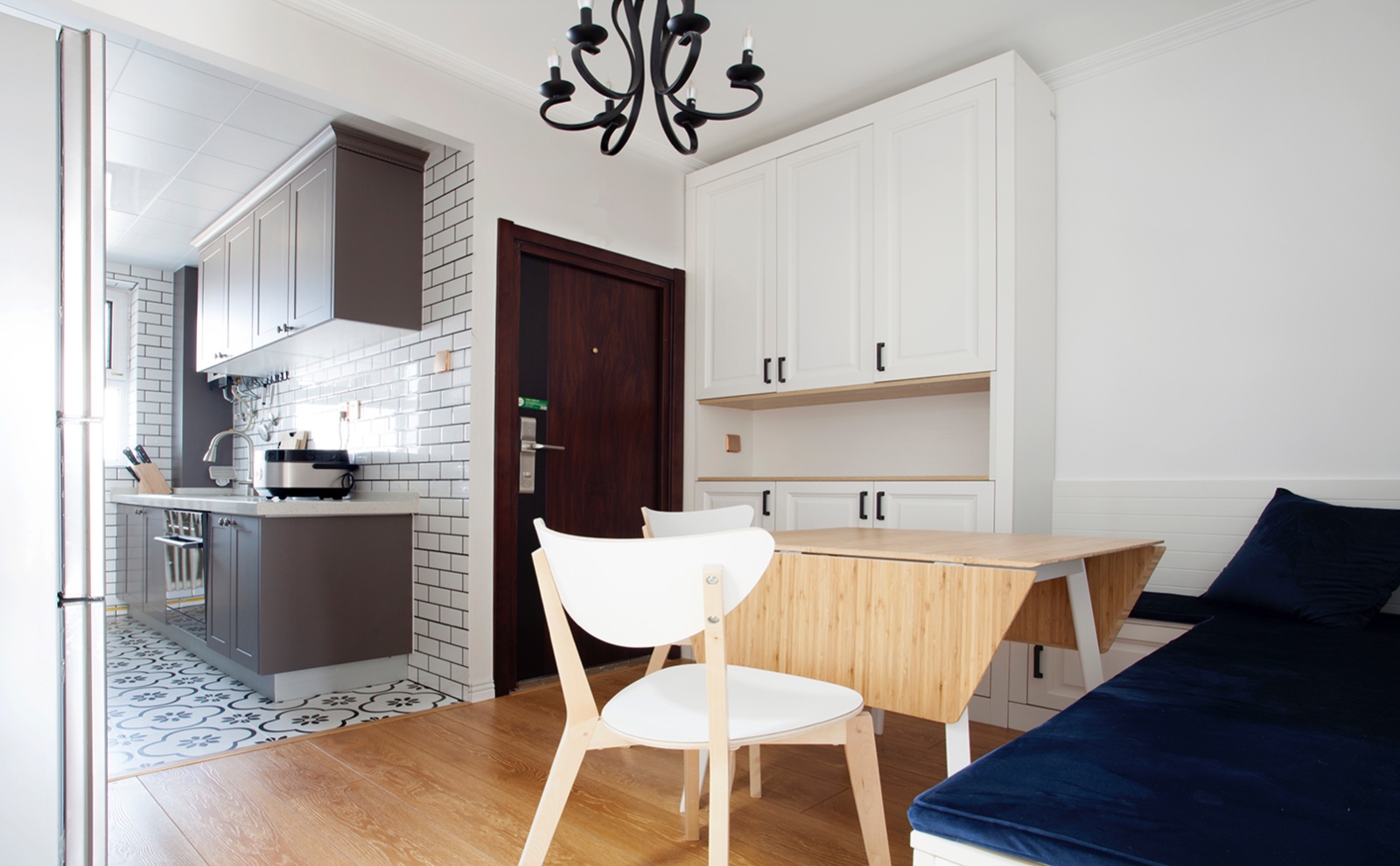 因?yàn)榭臻g有限,在入戶門旁邊做一個(gè)鞋柜和一個(gè)卡座餐廳。