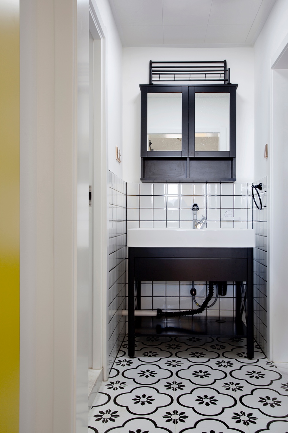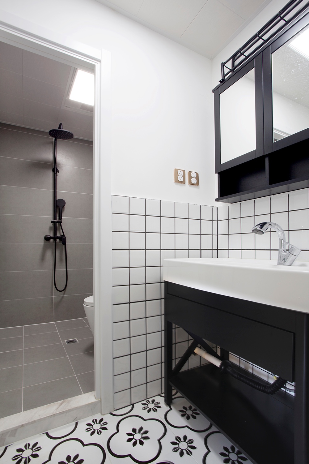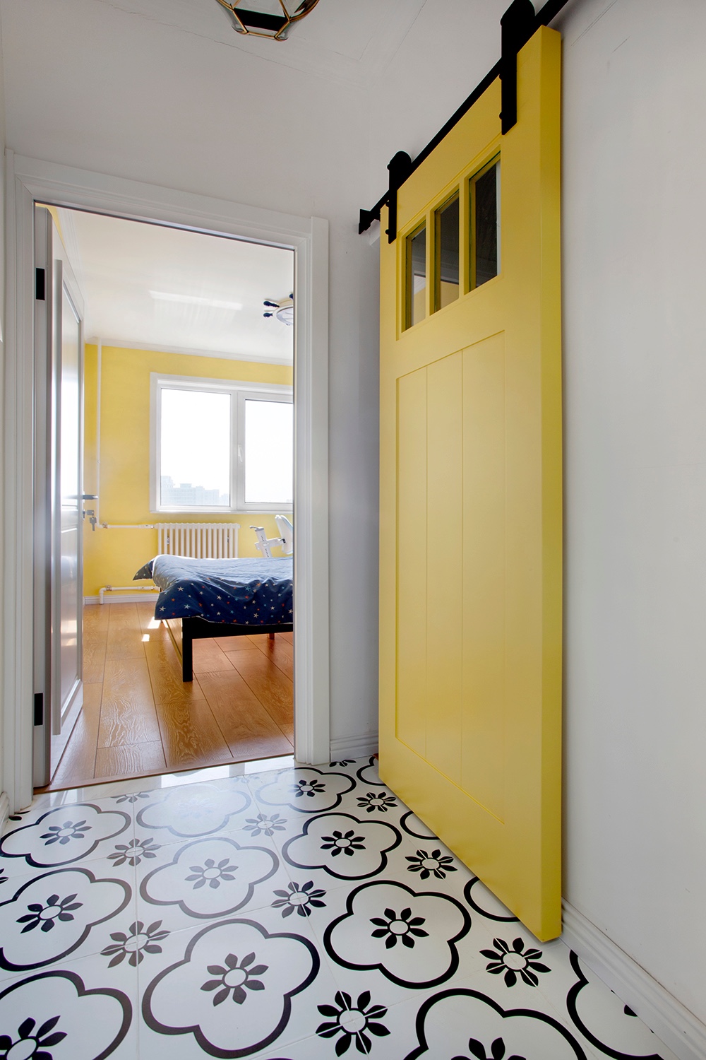 衛(wèi)生間空間小,干區(qū)走道采用了谷倉(cāng)門來(lái)節(jié)省空間。