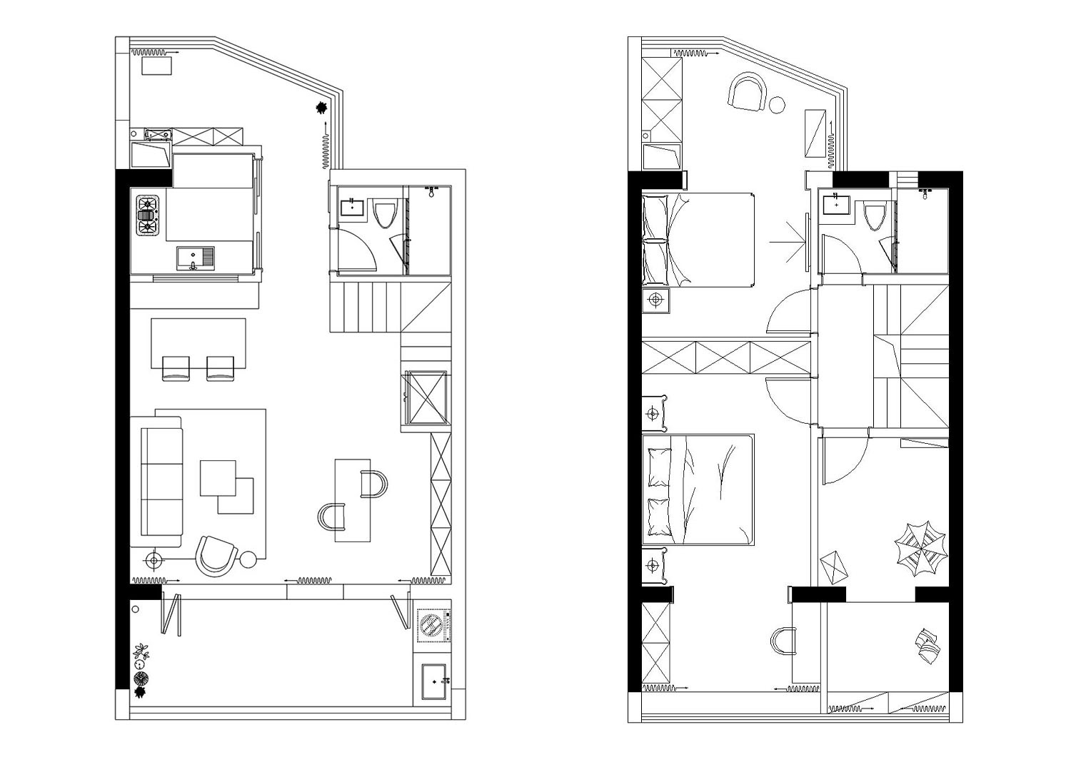 改戶型為上下2層的復(fù)式格局,采光特別好,一層為公共區(qū)域,二層為個(gè)人私密空間。