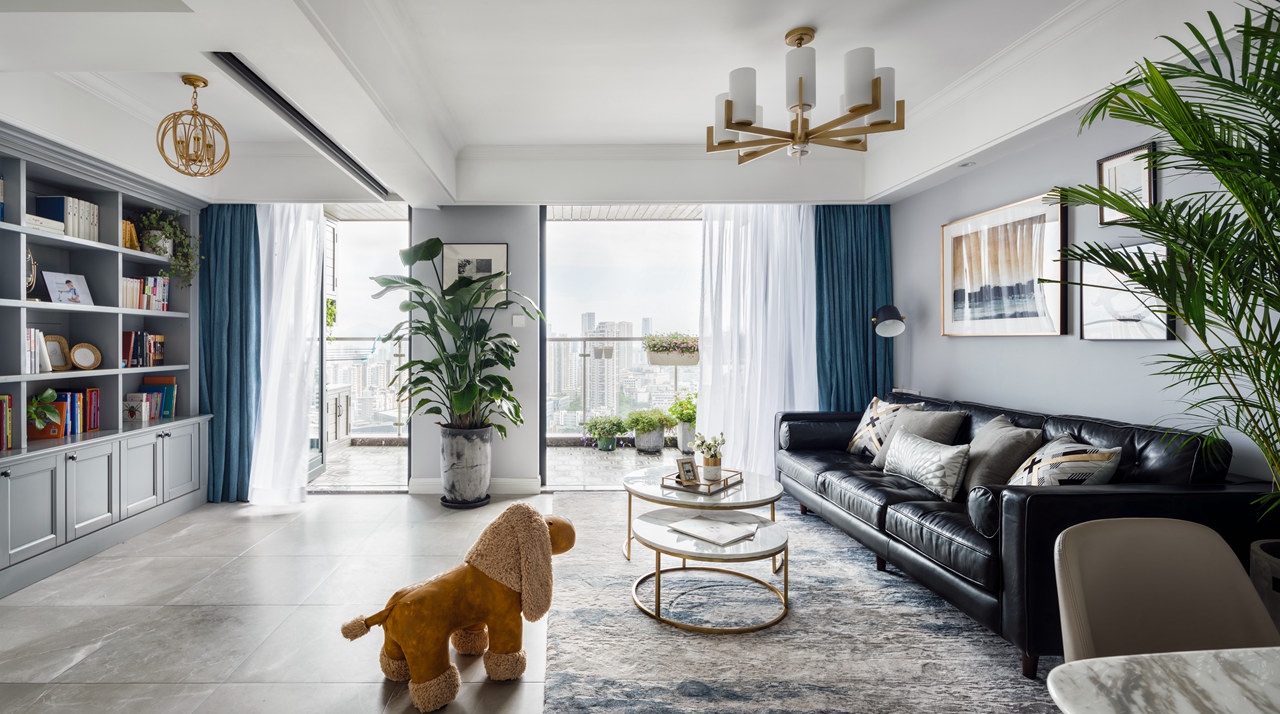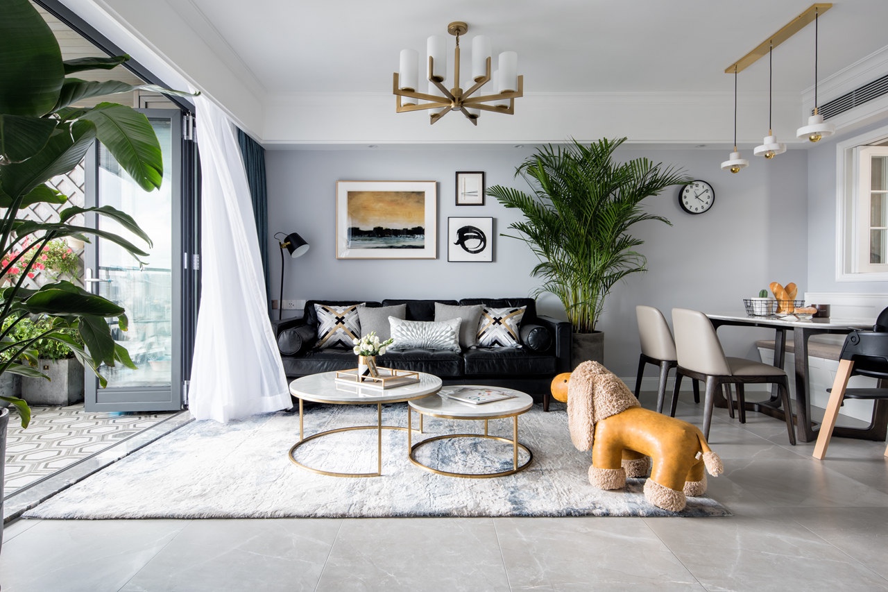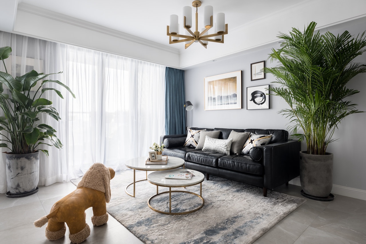 客廳選用黑的皮沙發(fā),給人一種不一樣的感覺,因?yàn)椴晒饨o力,不用擔(dān)心顏色太深問題。