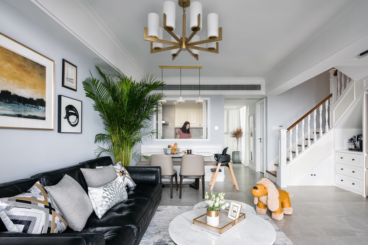 頂面簡單做了一個(gè)中央空調(diào),樓梯采用實(shí)木包裹,給人一種柔和的感覺,在餐廳和廚房之間開一個(gè)窗戶,在做飯的時(shí)候可以和家人溝通。