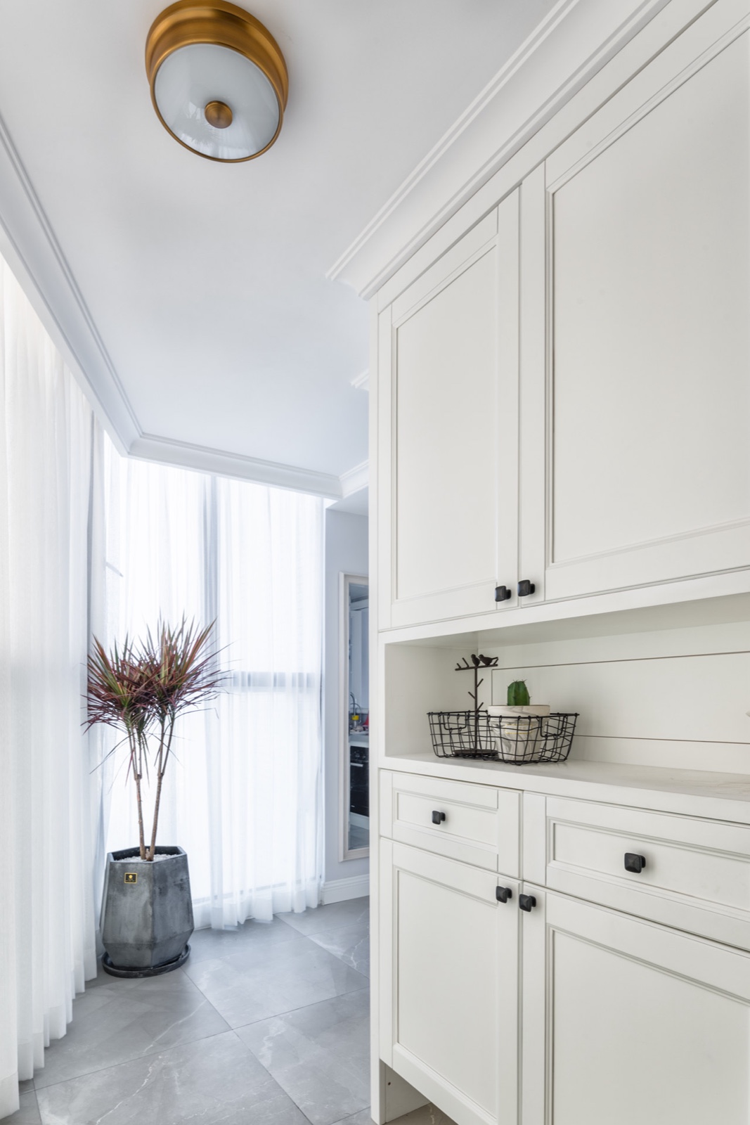 白的柜子配上藍(lán)色的花瓶給人一種純潔靜謐的感覺。
