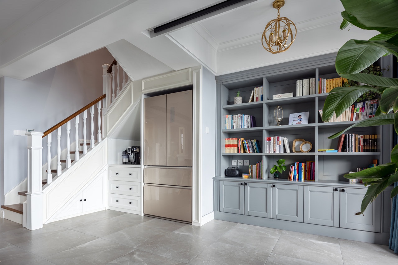 在樓梯下面做了一個(gè)儲物間,把對開門的大冰箱給嵌入里面,旁邊順勢做一排書柜。