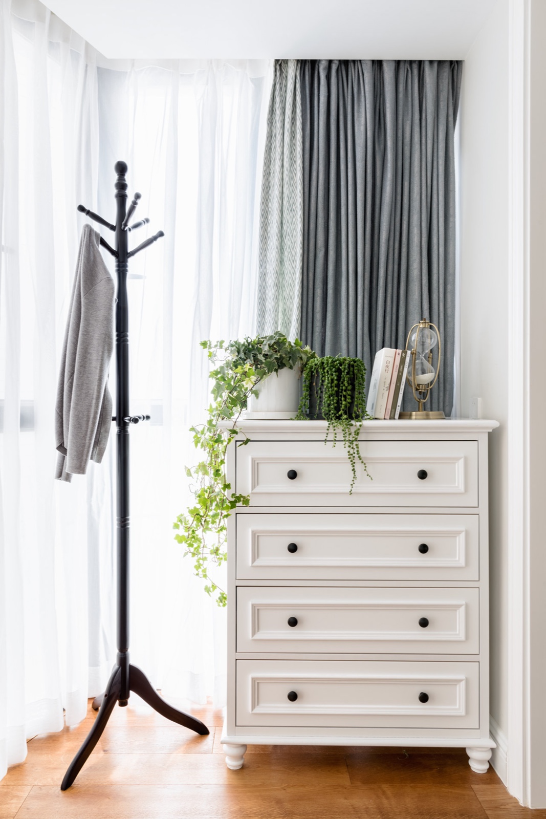 陽臺放一個(gè)五斗柜,放一些私密的衣物,放一點(diǎn)綠植,增加空間活力。