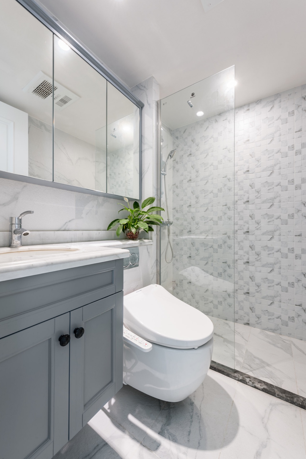 衛(wèi)生間做了一個(gè)干濕分離,馬桶設(shè)計(jì)成壁掛懸空馬桶,便于后期打掃衛(wèi)生間。