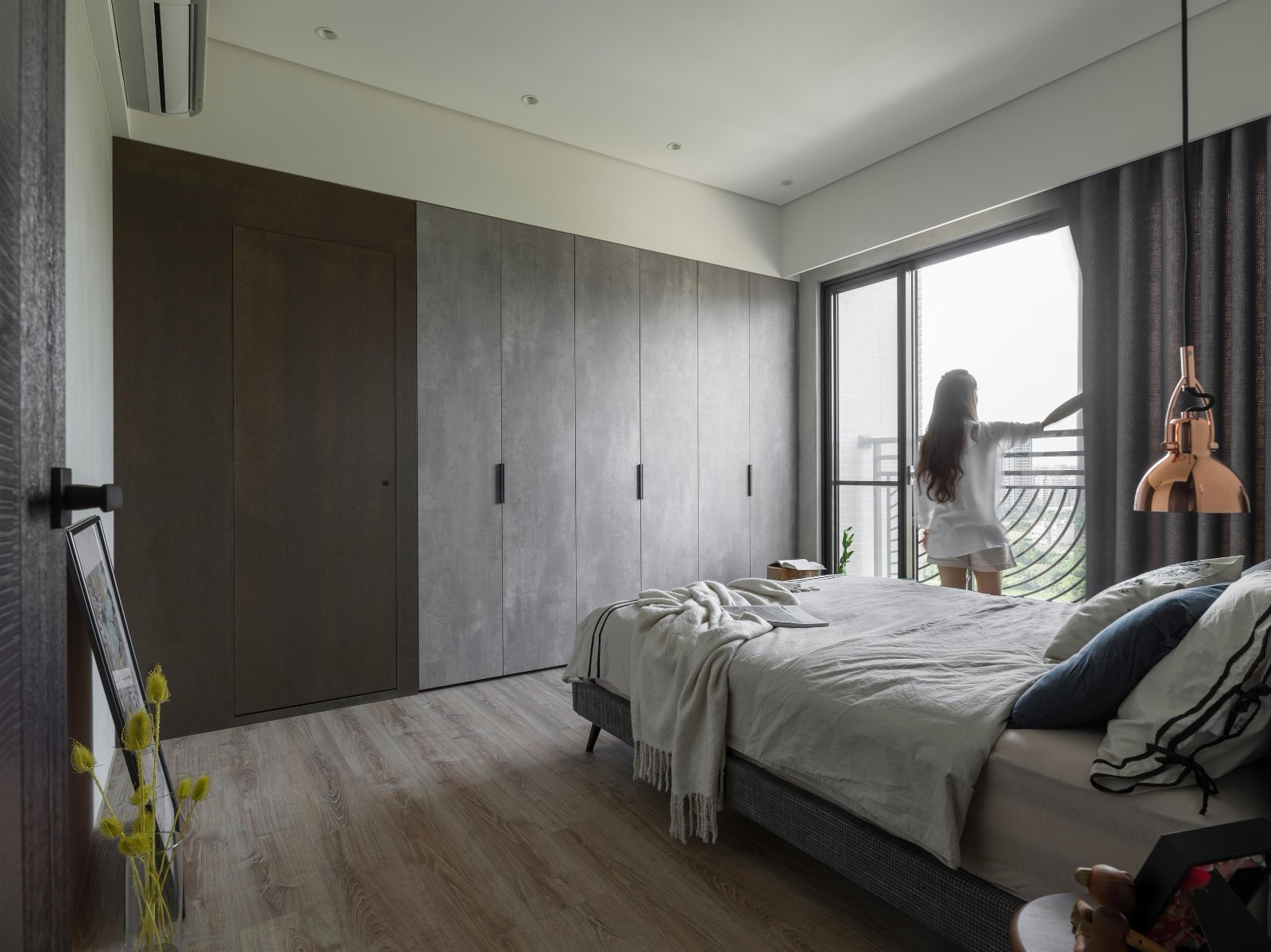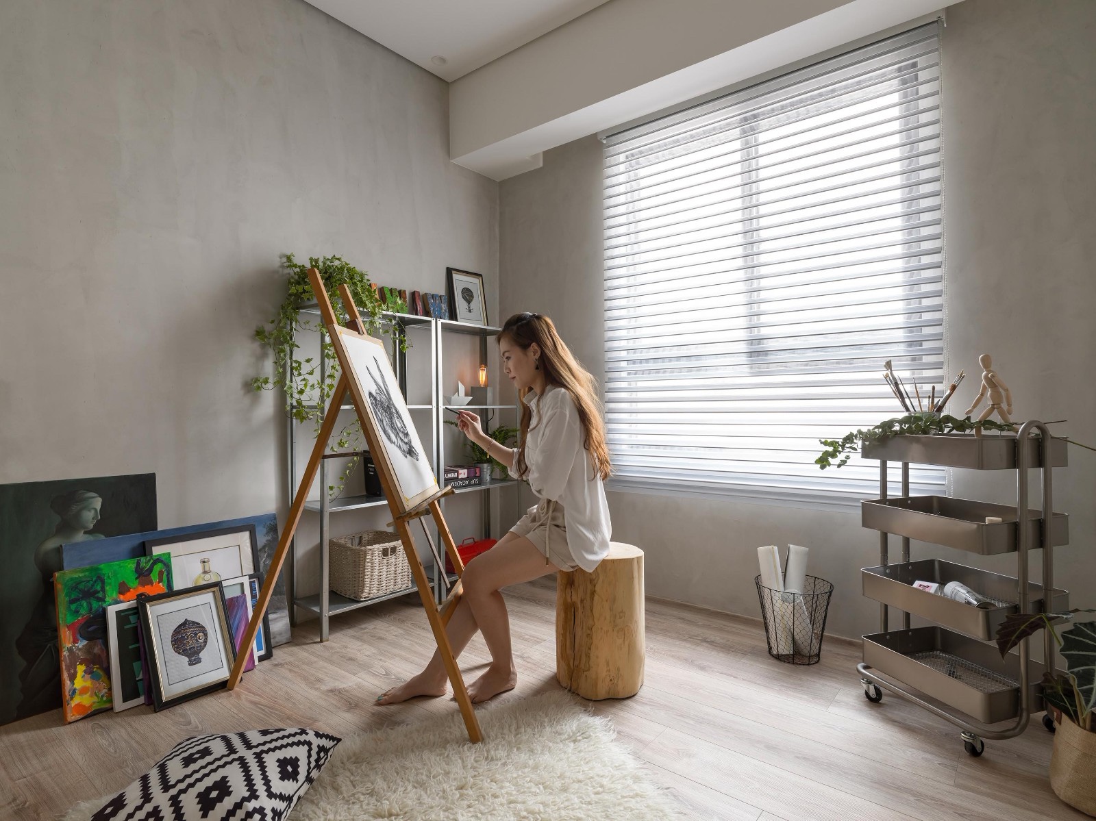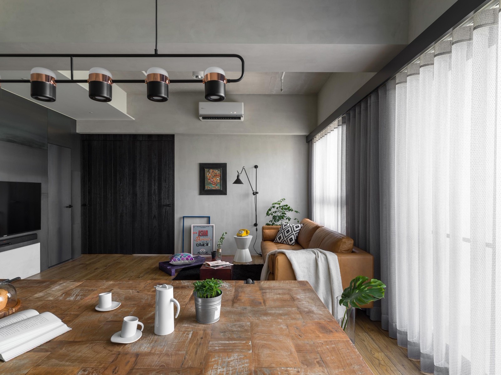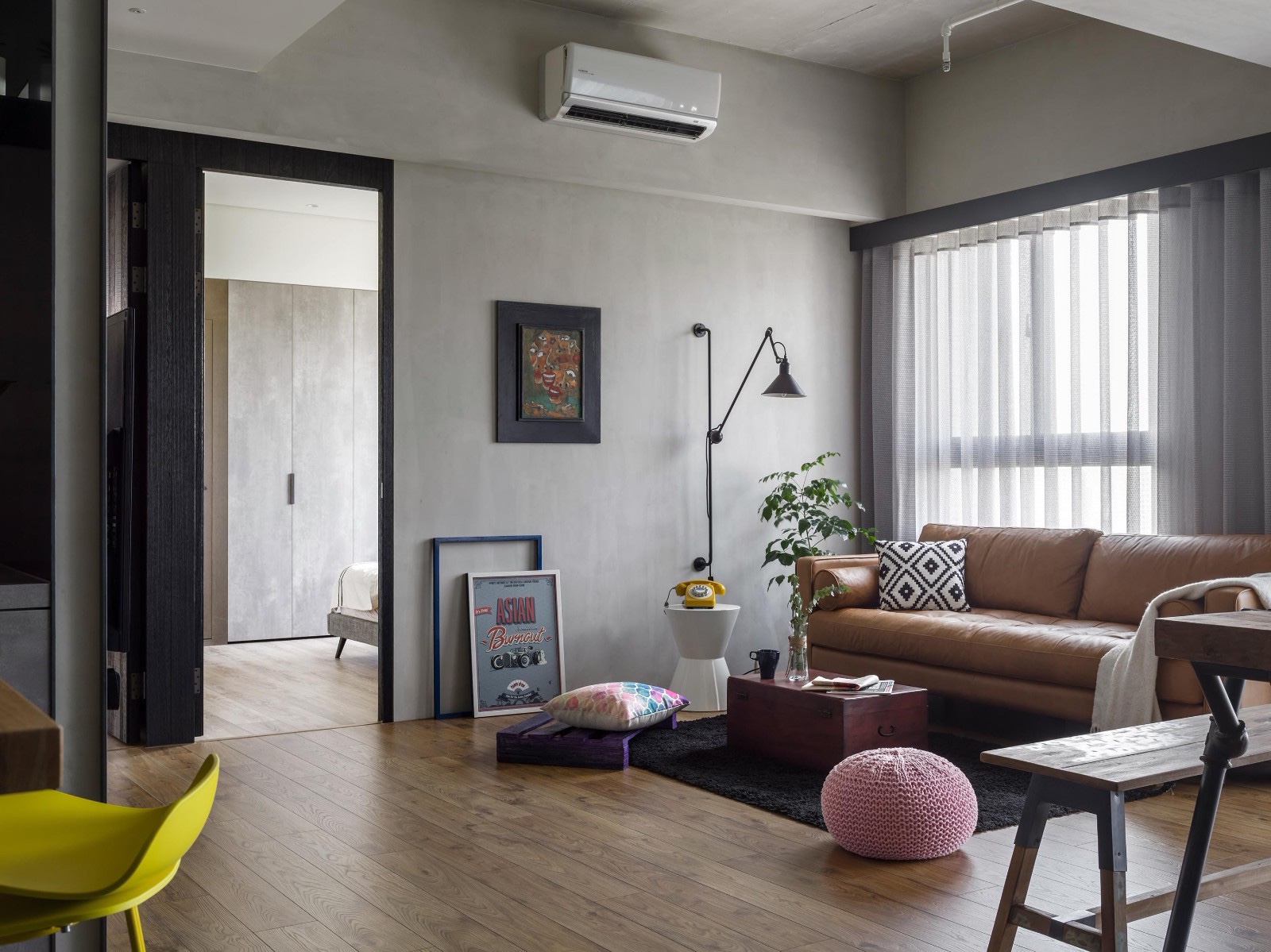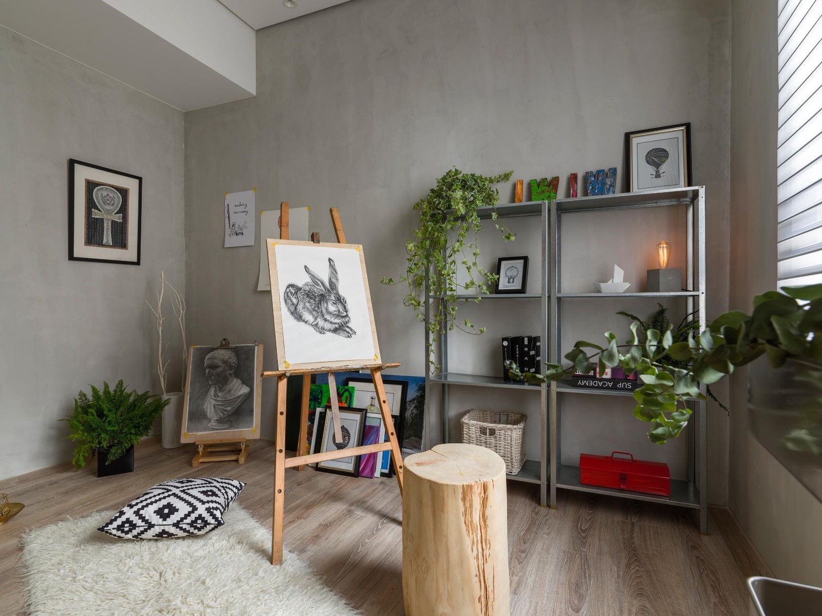 整體色調比較暗,墻面采用水泥灰的乳膠漆。