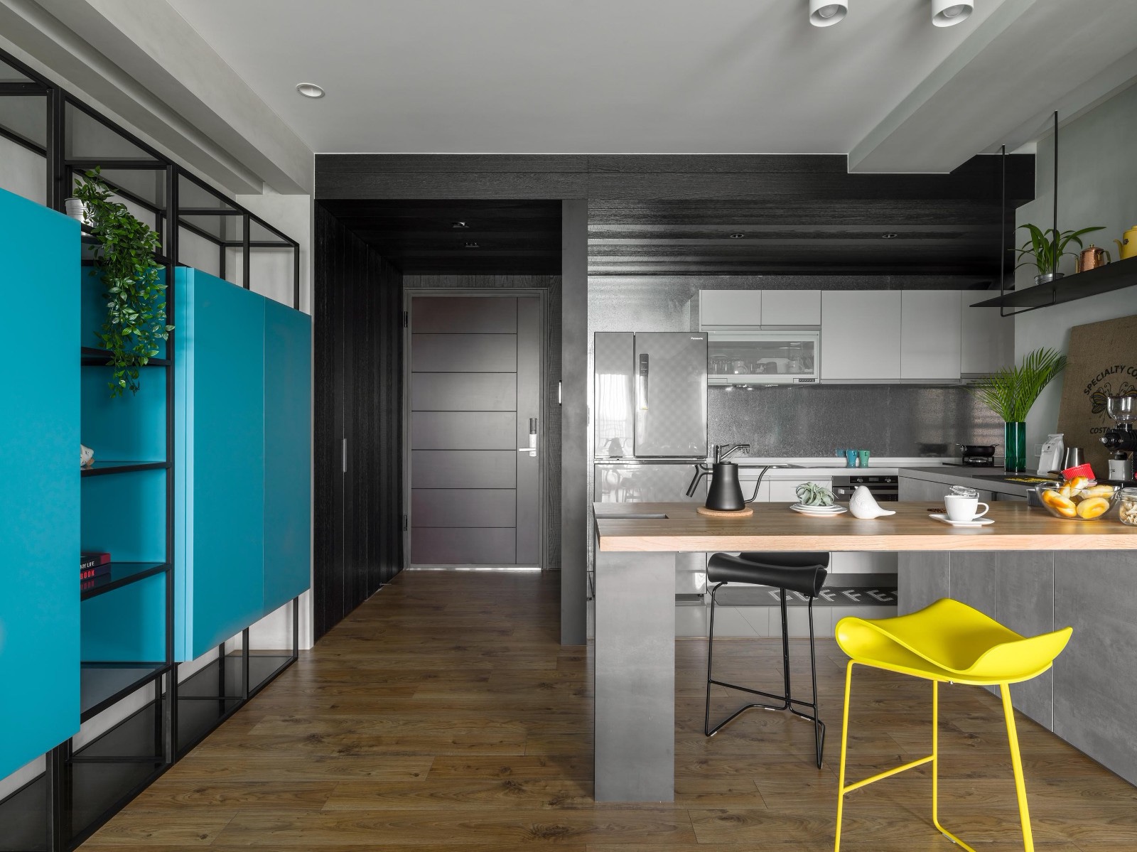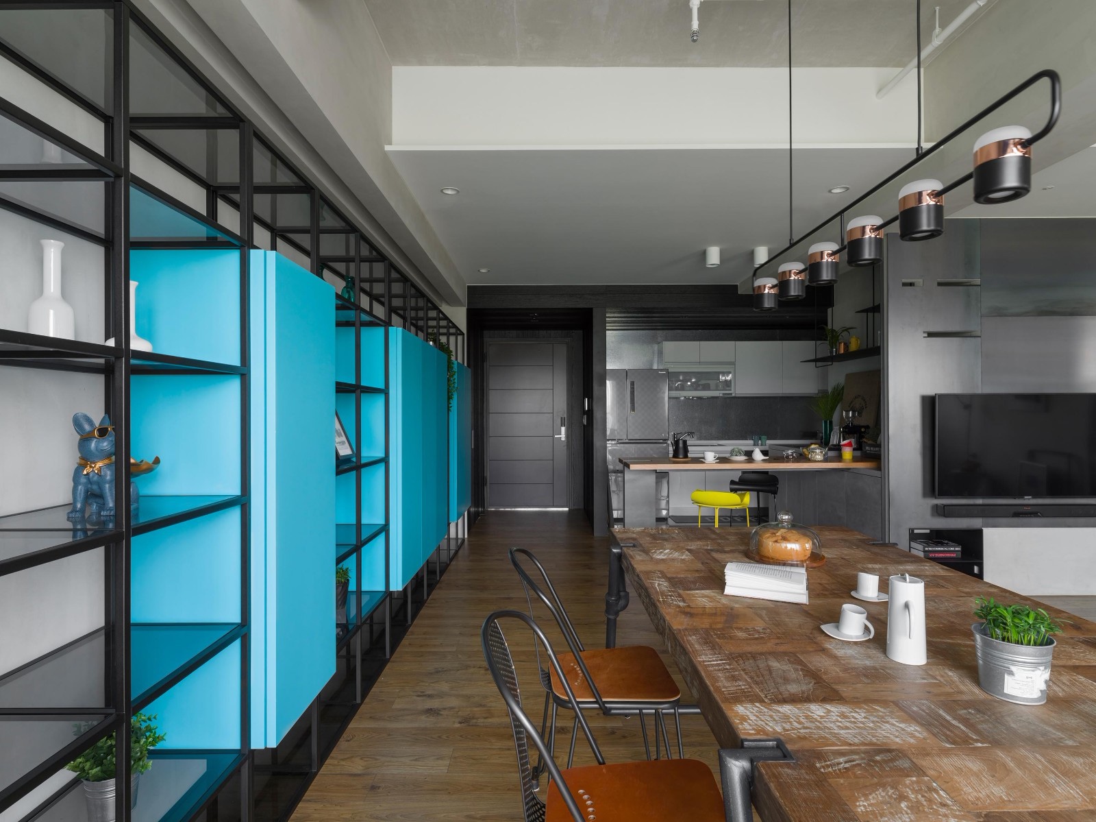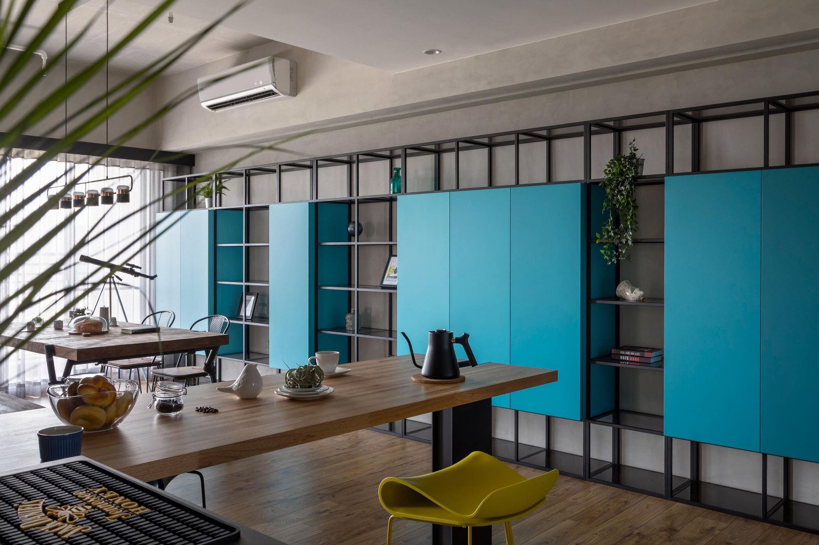在入戶門那面墻定制了一排柜子,門板選用亮藍色,使整體空間不會顯的過于太平了。