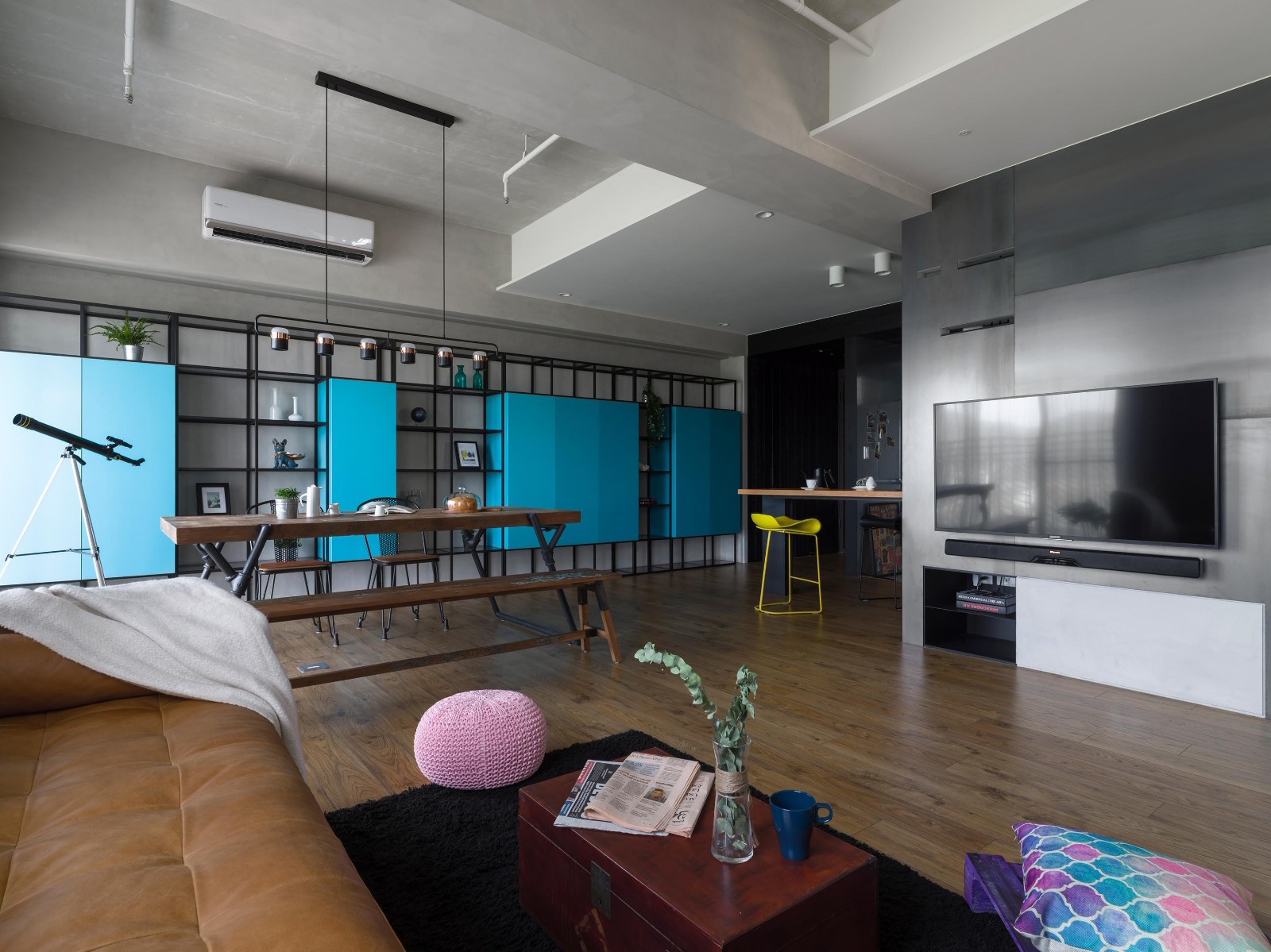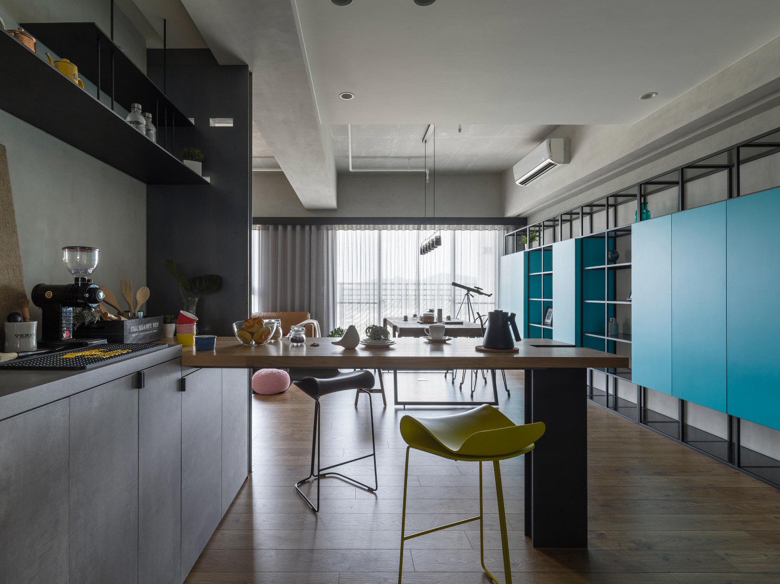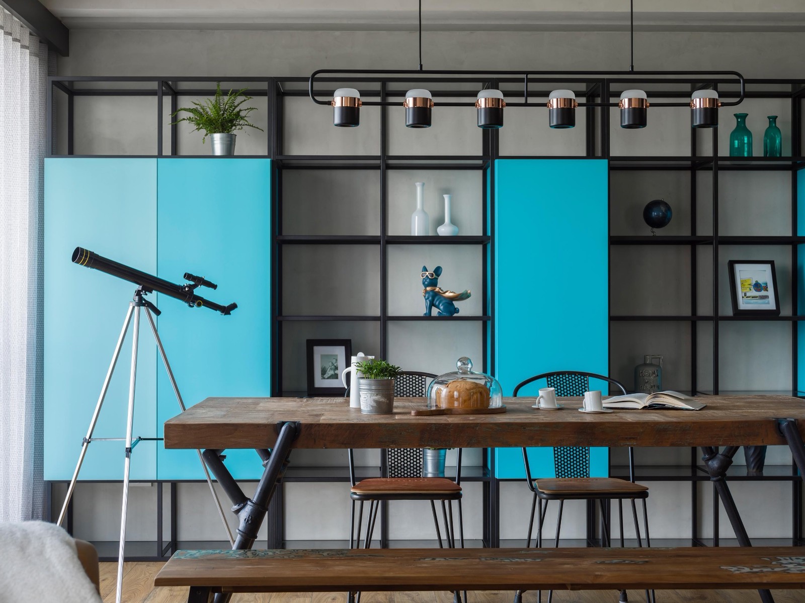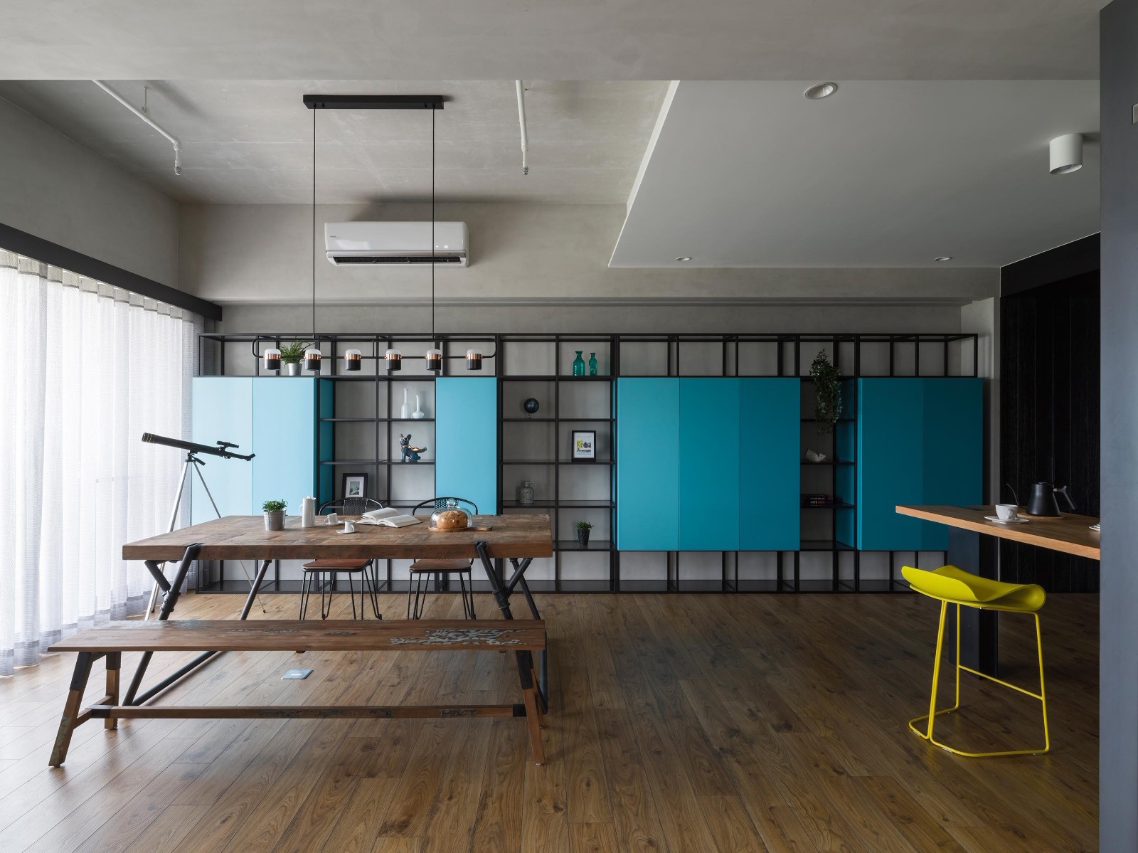 在入戶門那面墻定制了一排柜子,門板選用亮藍色,使整體空間不會顯的過于太平了。