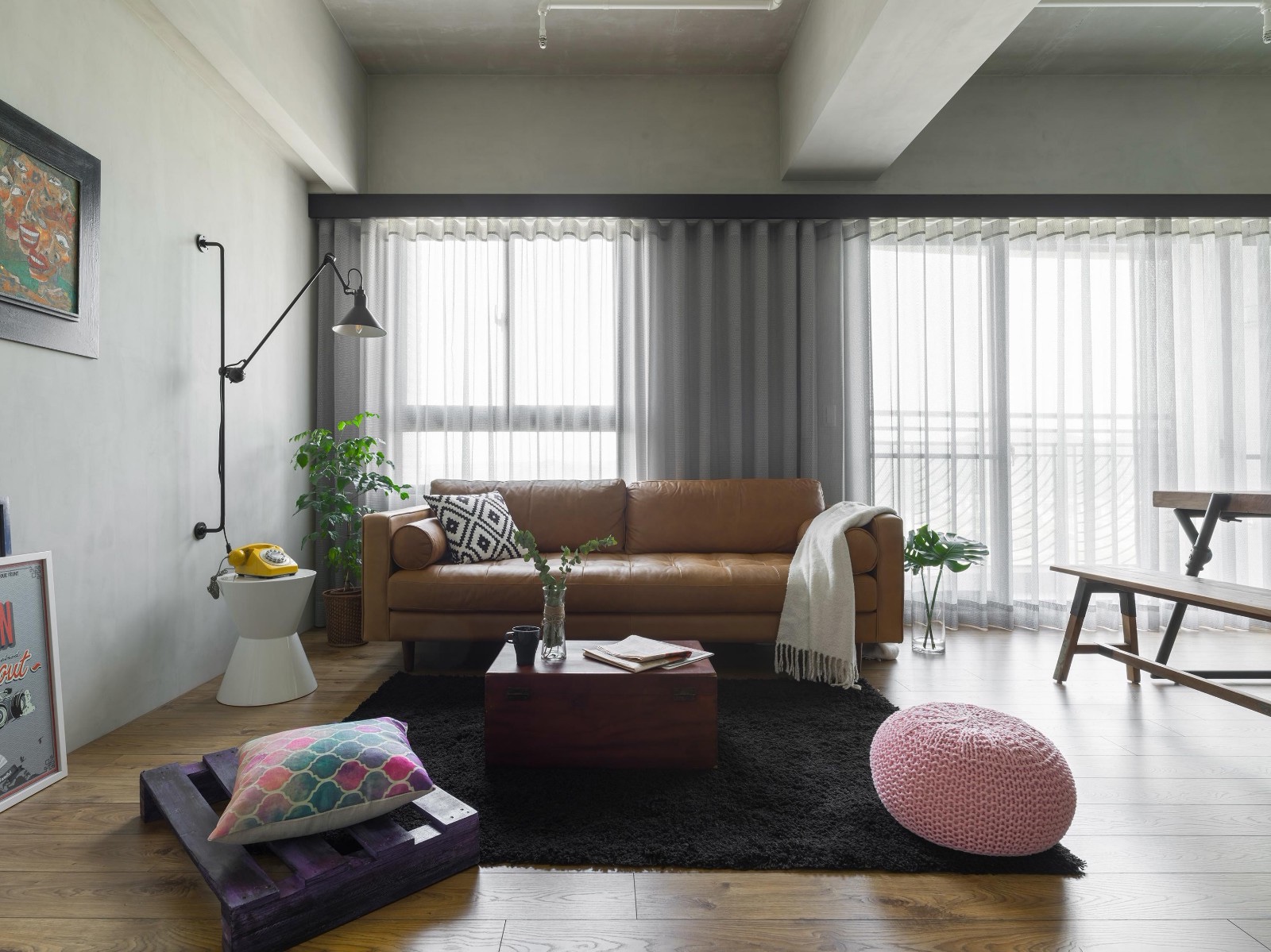 墻面和地面時暗色,沙發(fā)選用一個橘色的皮質來點綴。