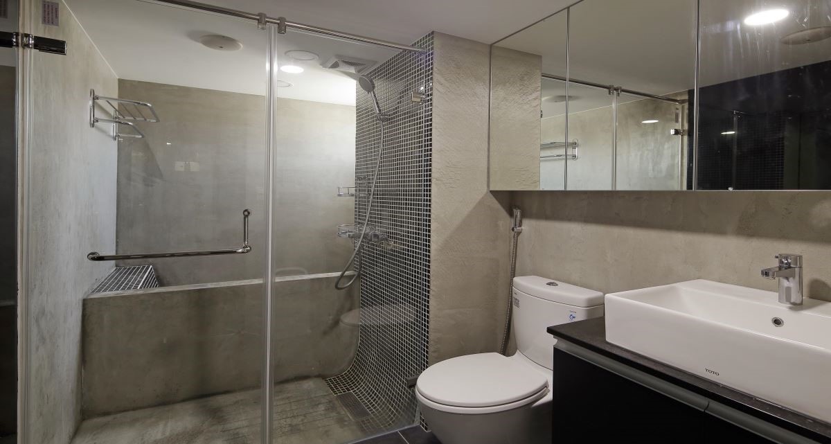 衛(wèi)生間改造成干濕分離。墻面采用防水水泥漆,淋浴區(qū)貼馬賽克小瓷磚。