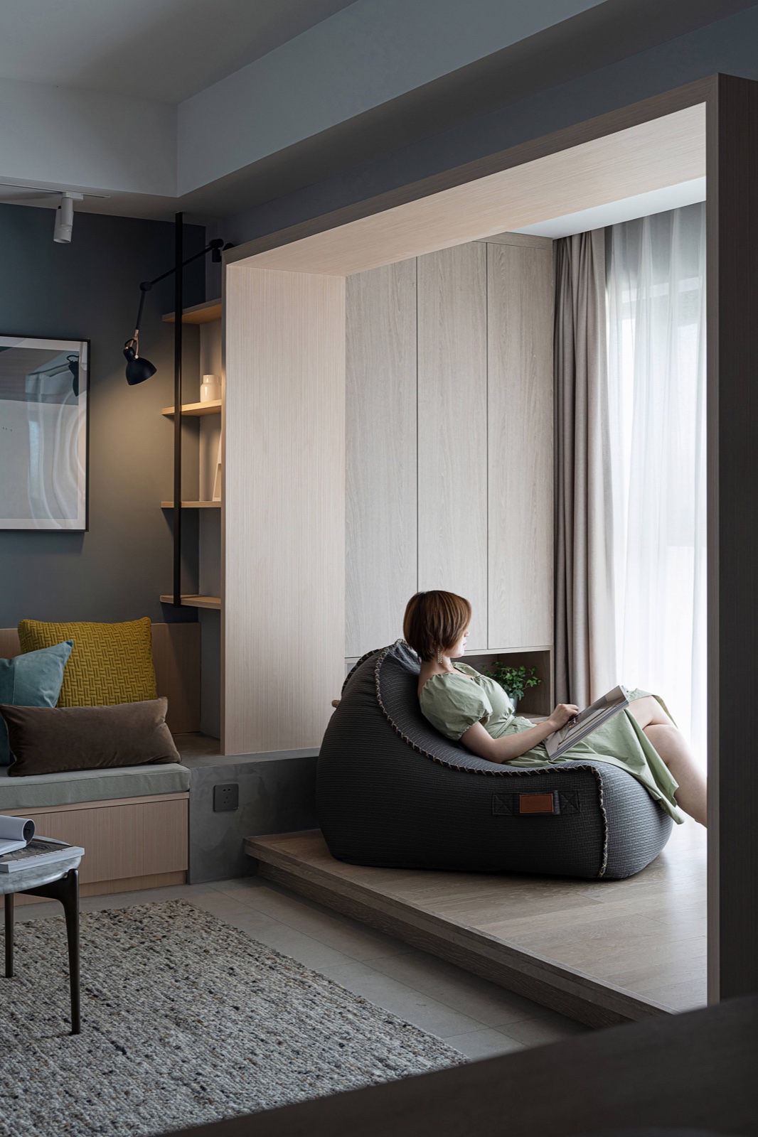 陽臺(tái)作為一個(gè)休閑區(qū)域,側(cè)面做成柜子增加儲(chǔ)物空間,平時(shí)可以在陽臺(tái)看看書喝喝茶。