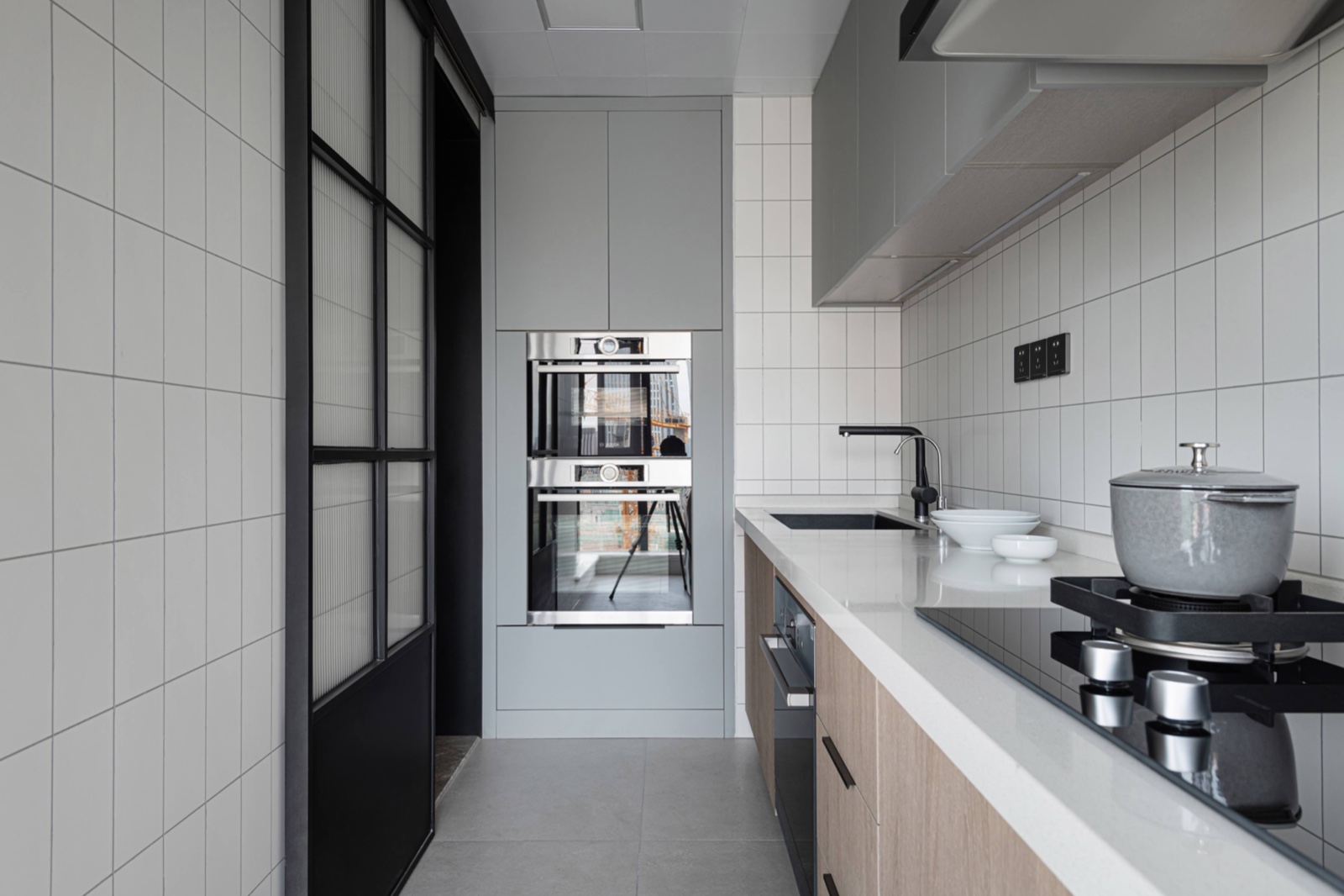 廚房整體以現(xiàn)在網(wǎng)紅款來設(shè)計(jì)的,小方磚,原木色的櫥柜搭配白色石英石臺(tái)面,顯得干凈。