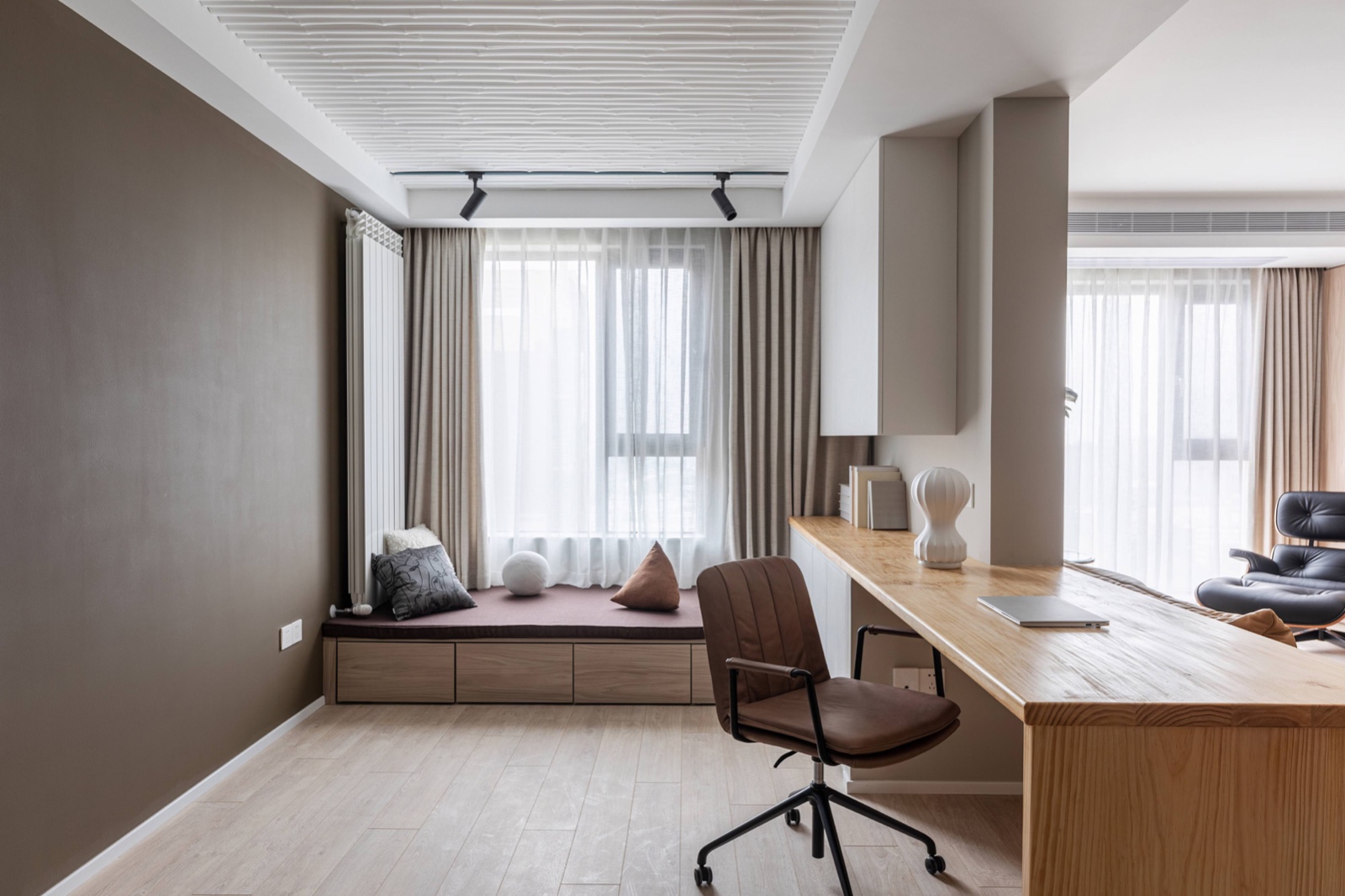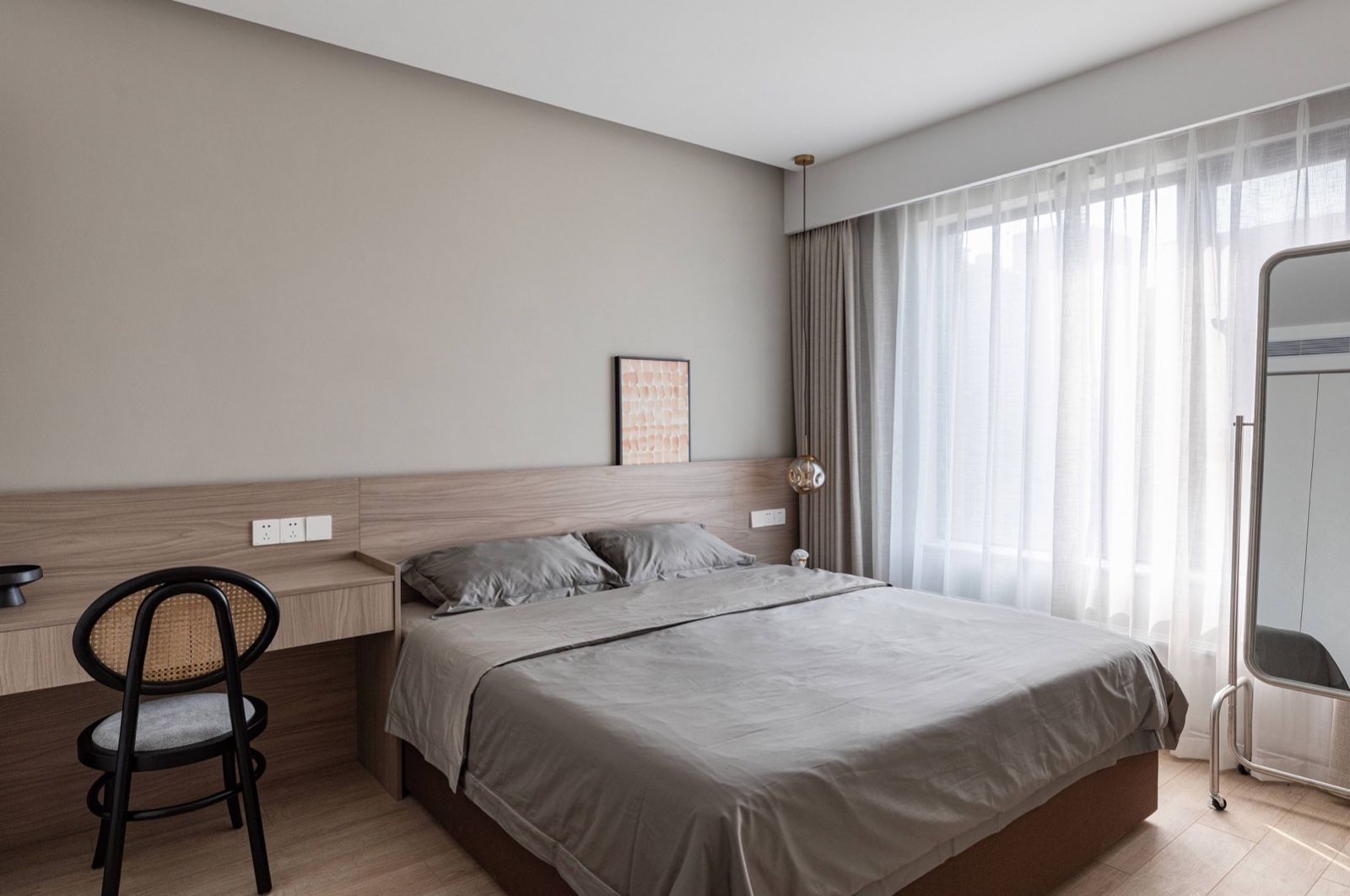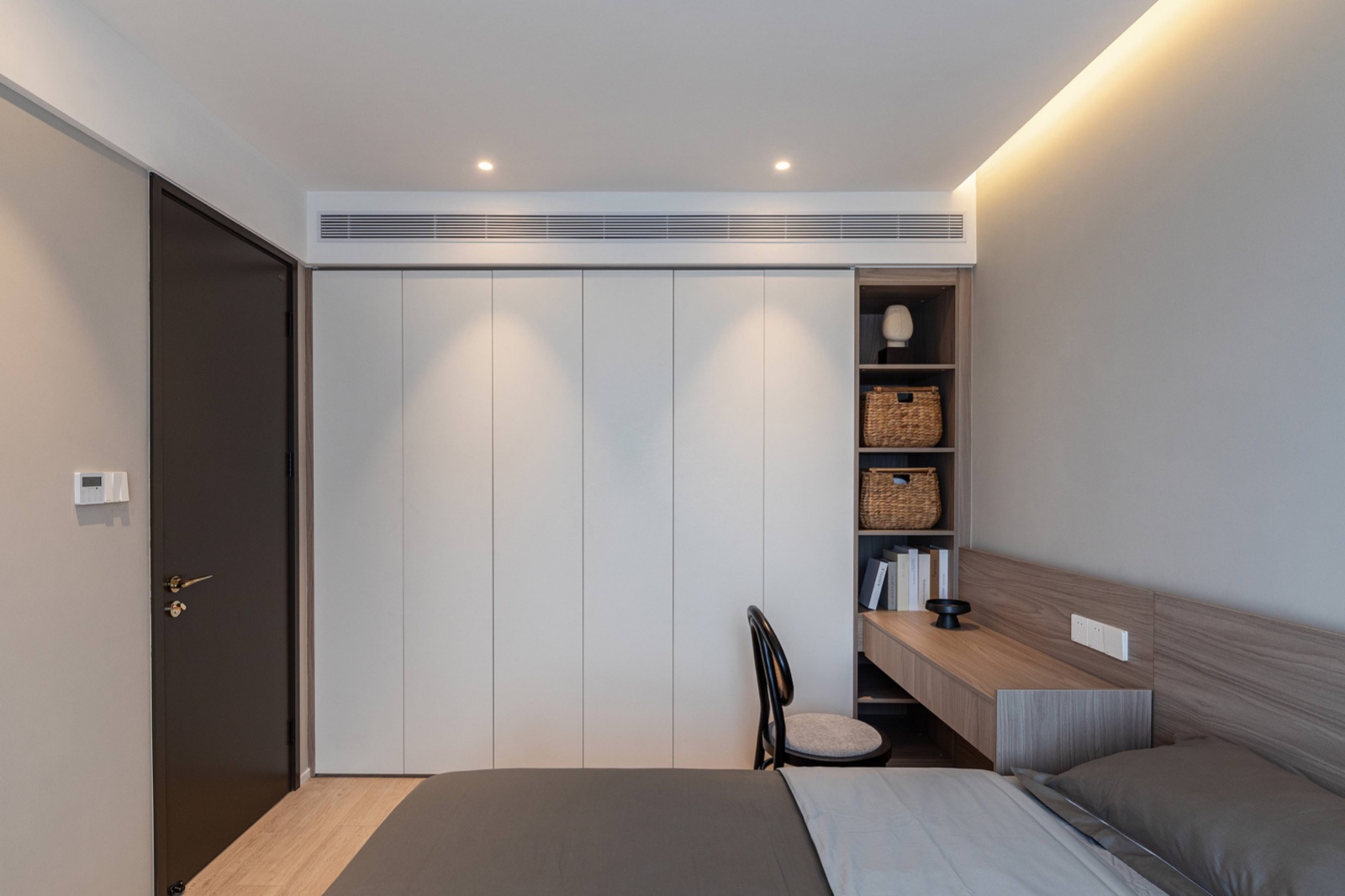主臥也是采用無主燈和洗墻燈來增加空間感,衣柜與書桌連體的空間有延伸感。