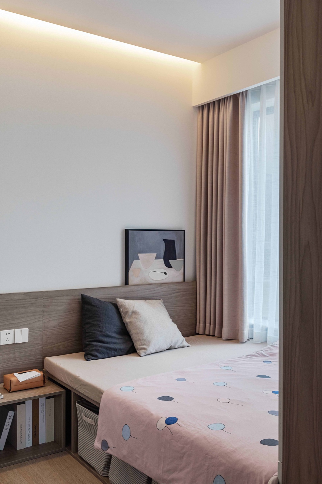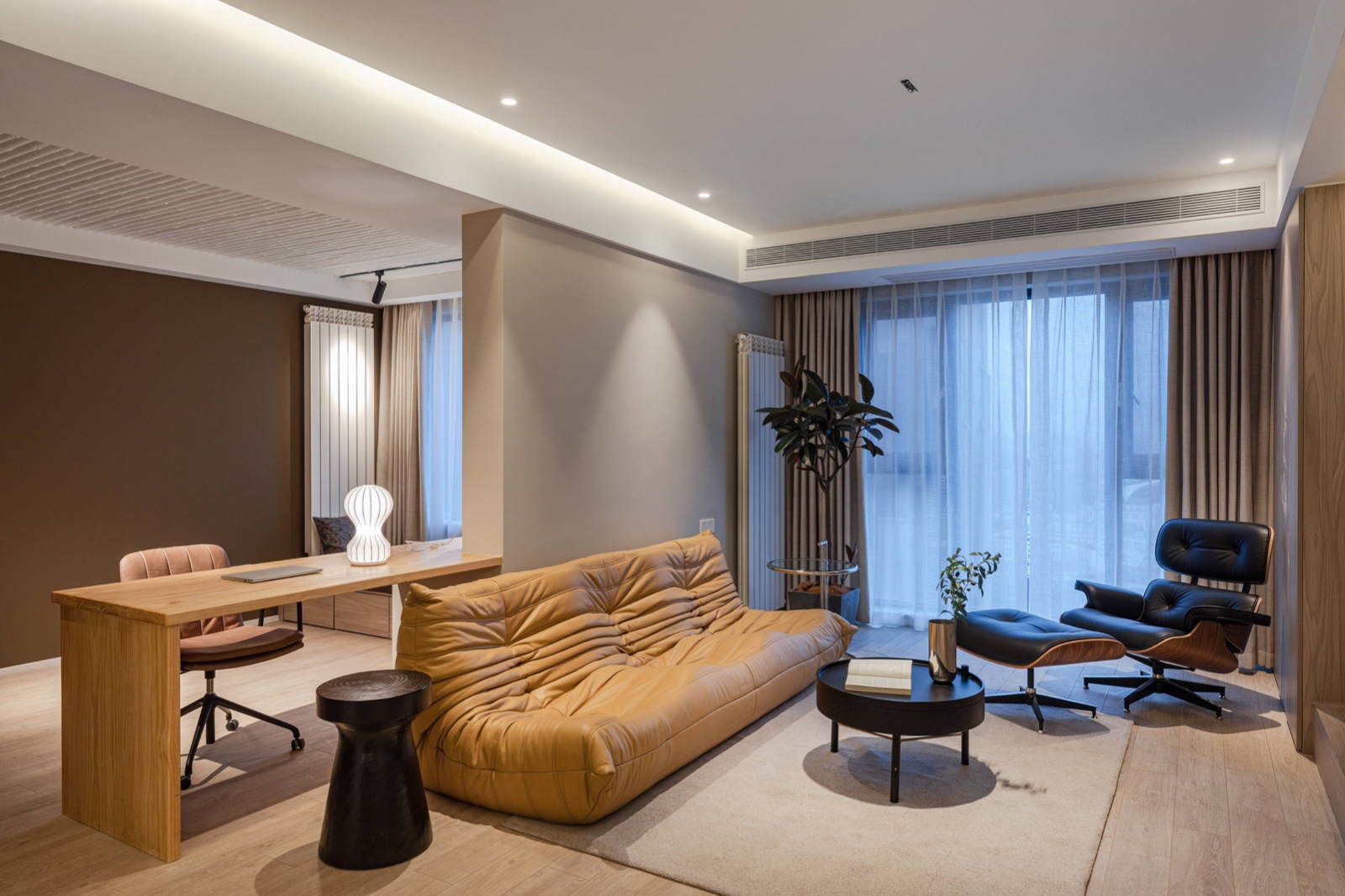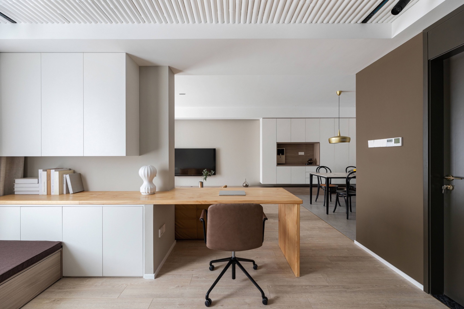 主臥也是采用無主燈和洗墻燈來增加空間感,衣柜與書桌連體的空間有延伸感。