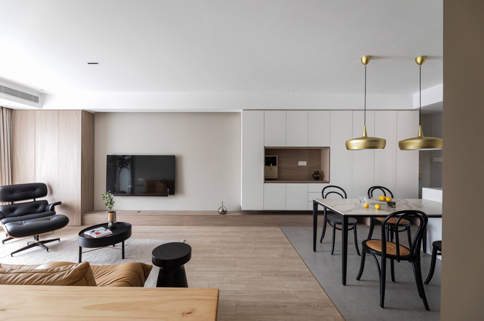 客廳與餐廳地面鋪不同的地板和瓷磚。