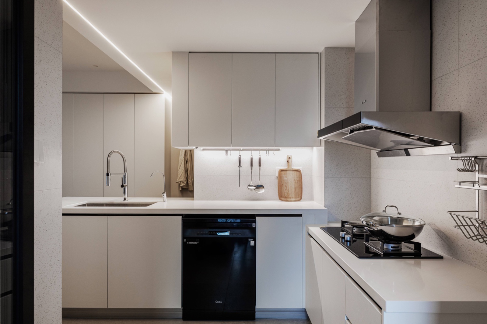 櫥柜整體采用淺色為主,吊柜下面增加燈帶,在晚上操作更有人性化。