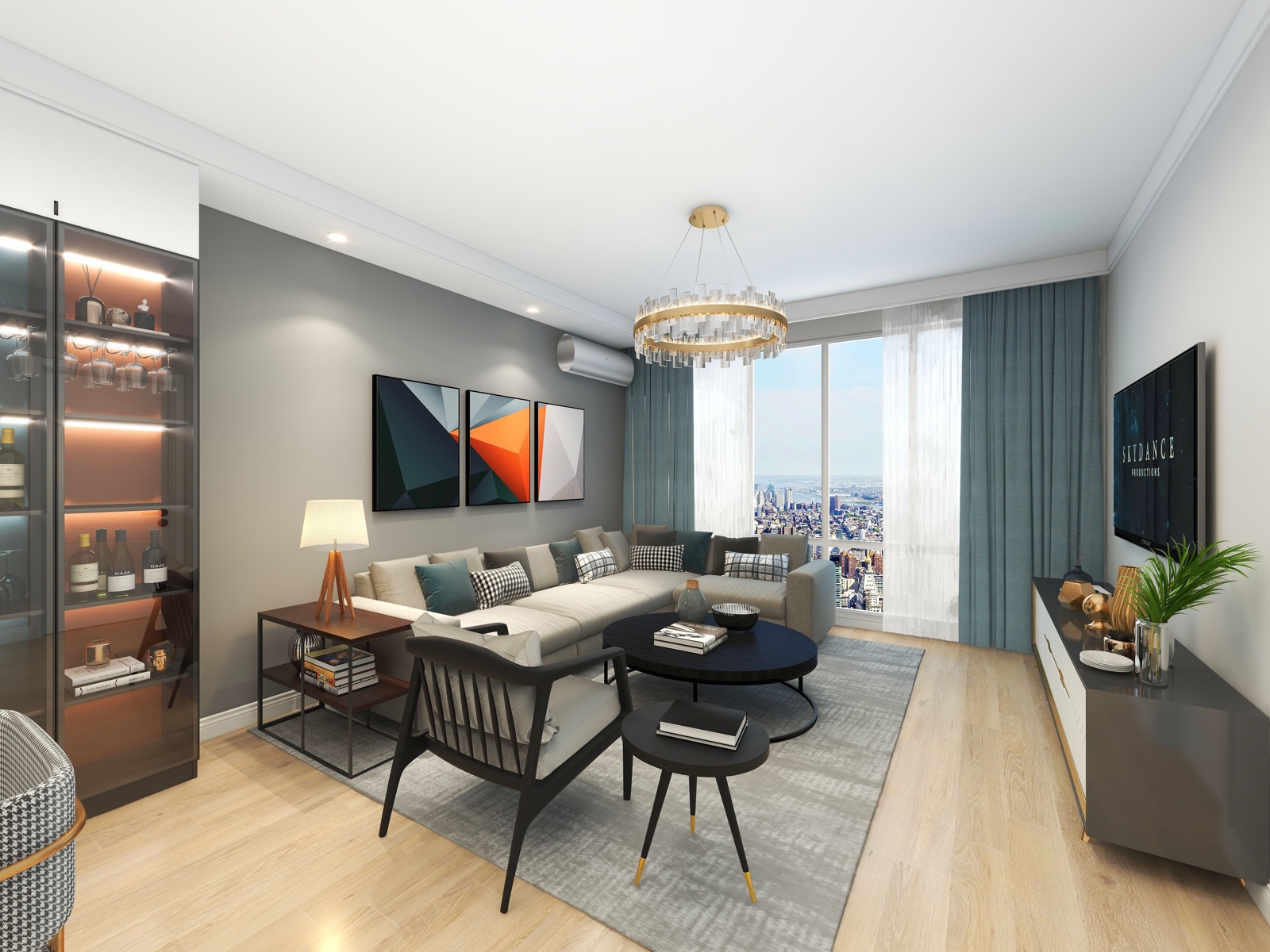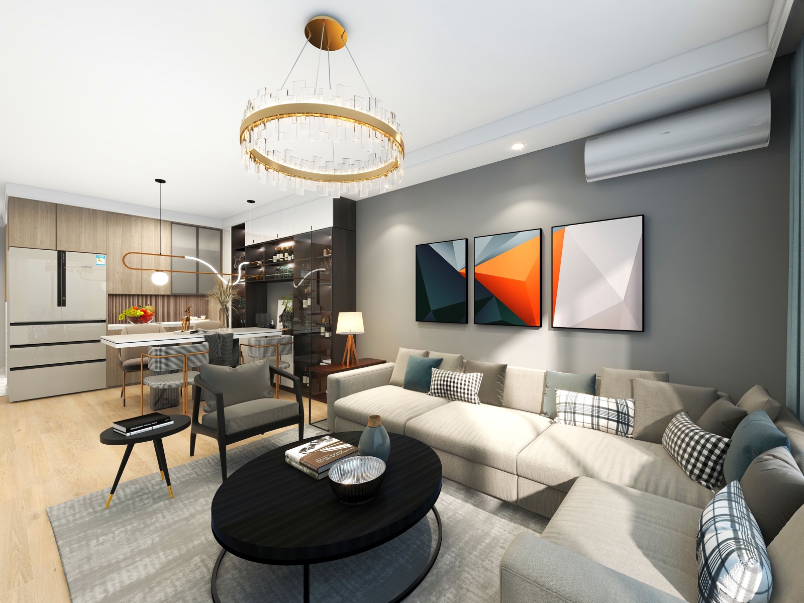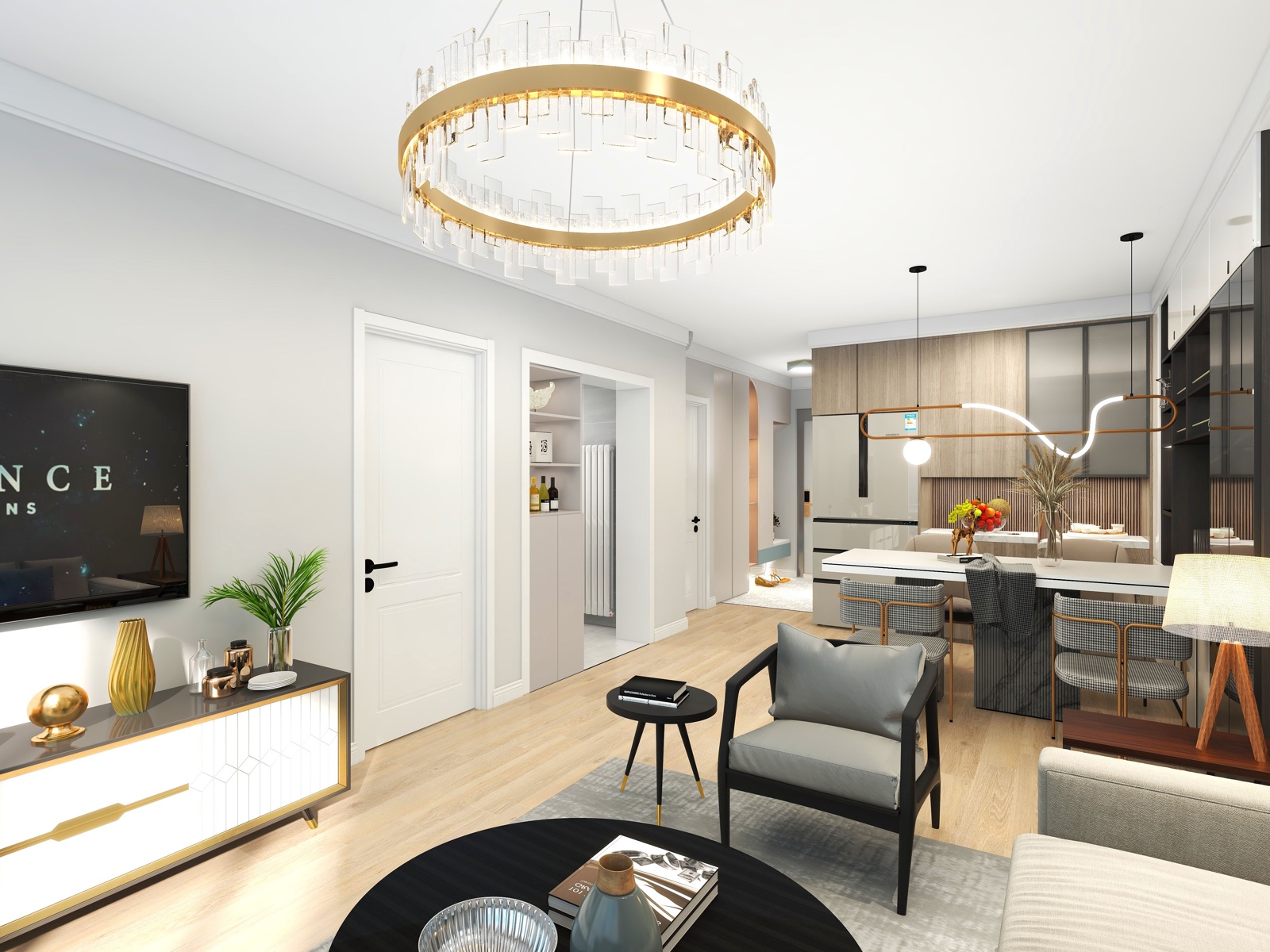 客廳空間比較大,業(yè)主需求既可以吃飯也可以后期辦公。