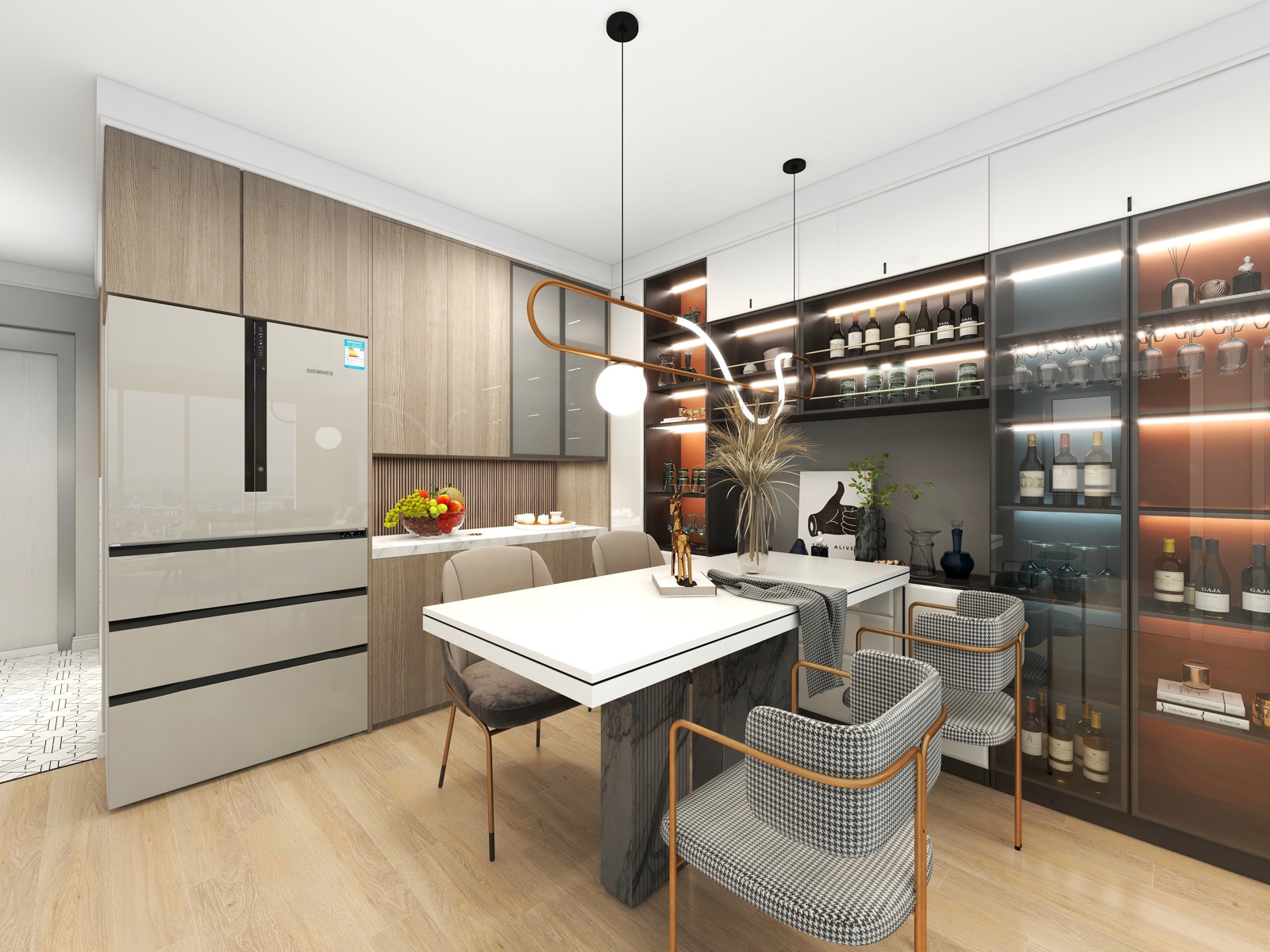 在餐廳部分定制了儲(chǔ)物柜,增加了儲(chǔ)物空間。