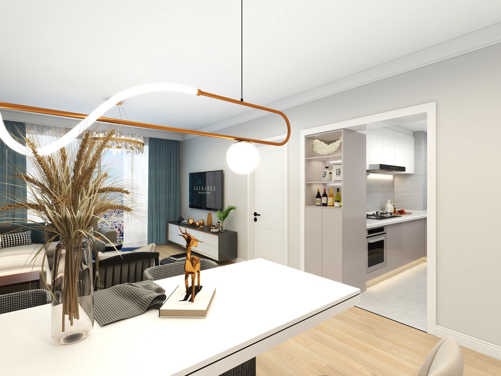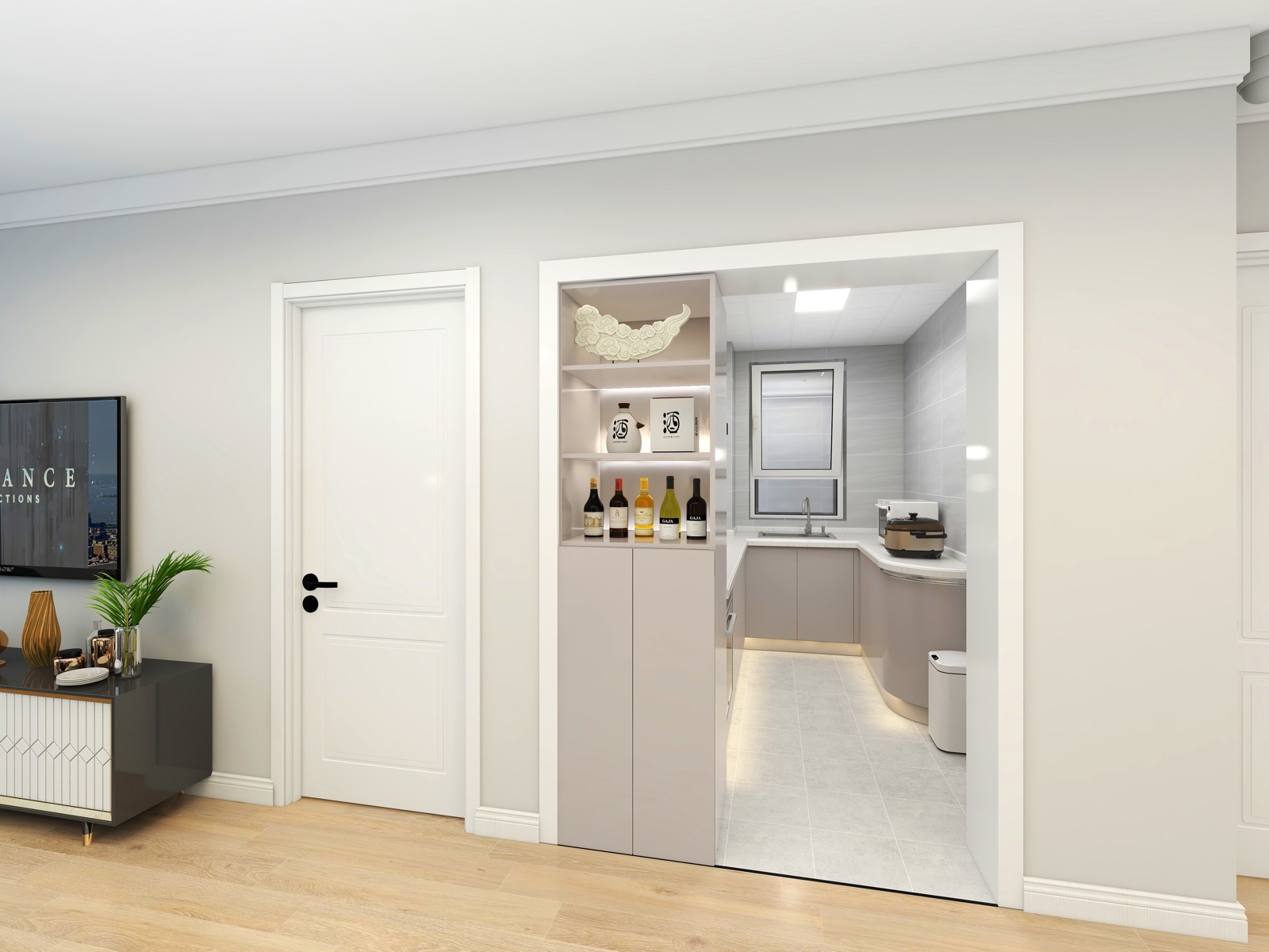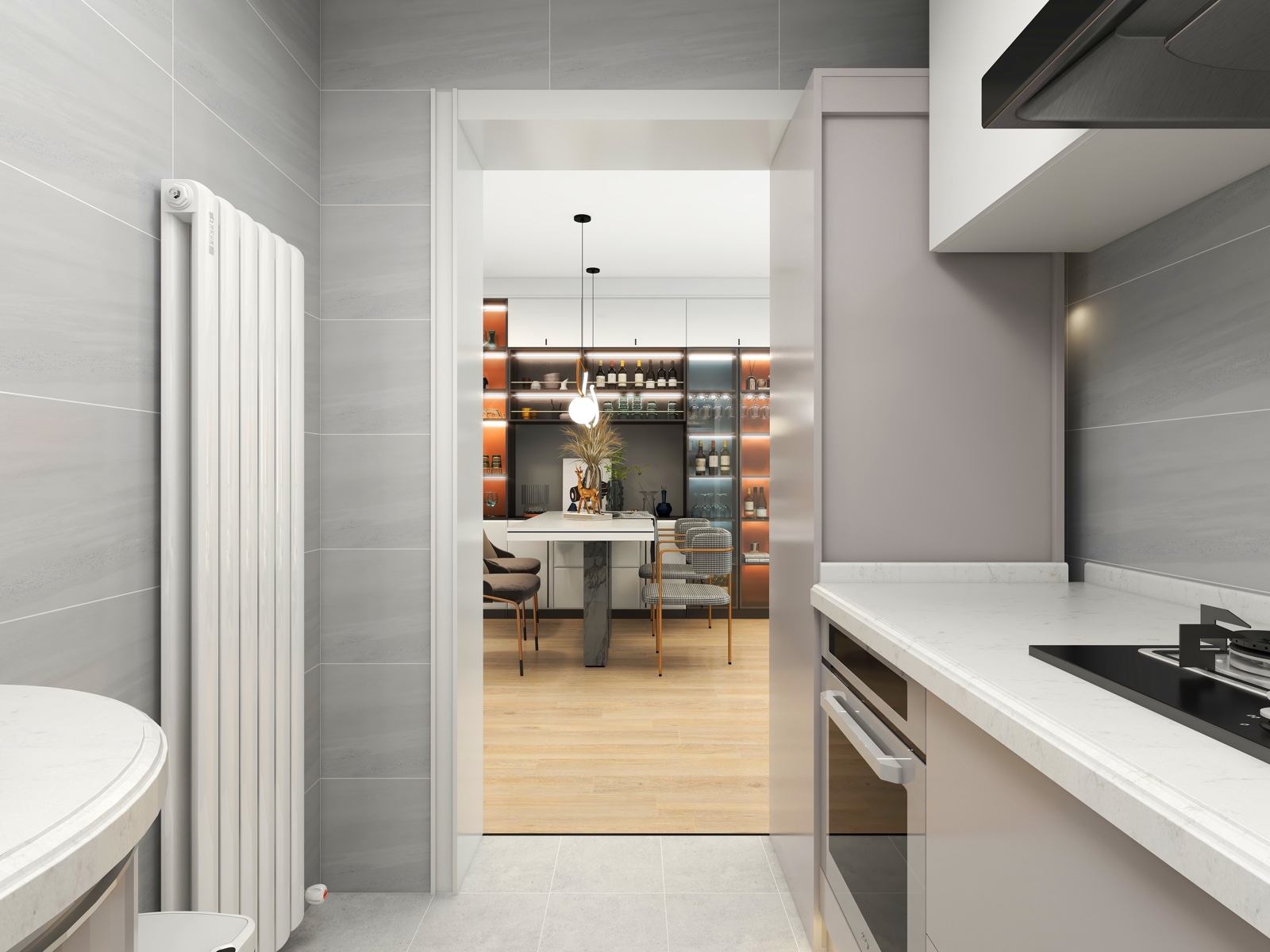 廚房改為開放式但是在原來墻的位置做一個(gè)高柜,既可以儲(chǔ)物也可以當(dāng)一個(gè)屏風(fēng)。
