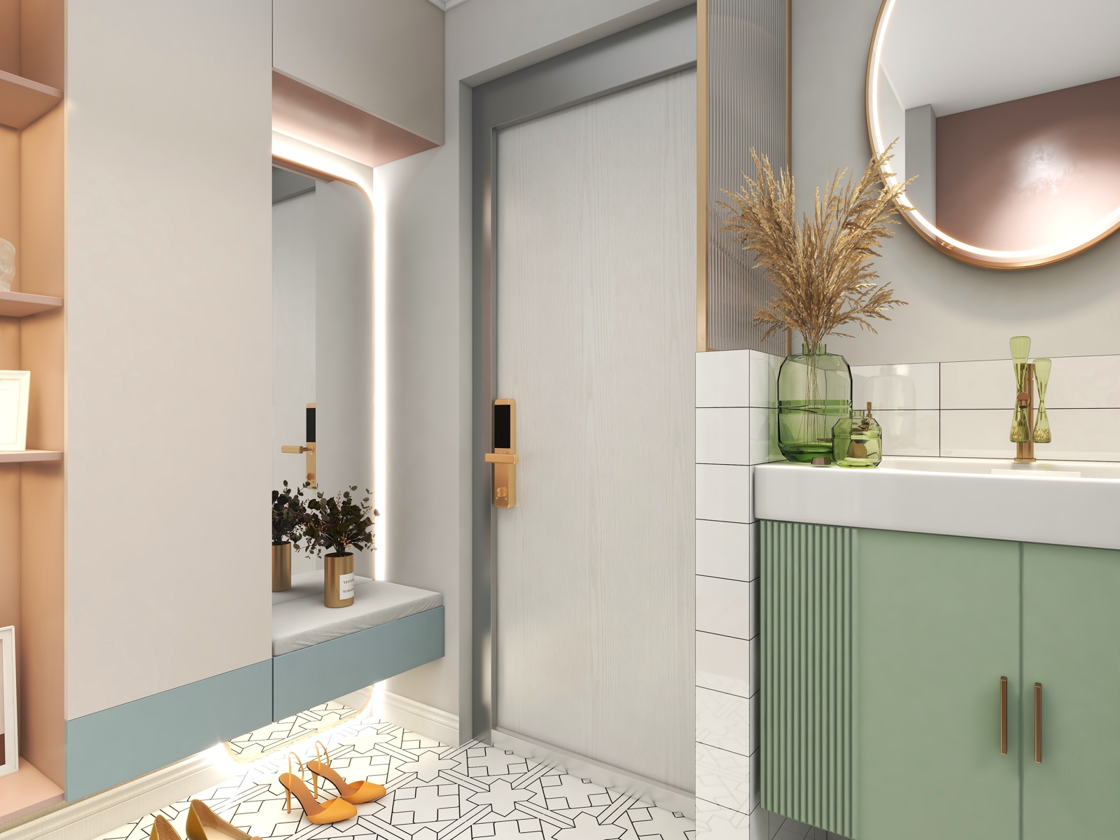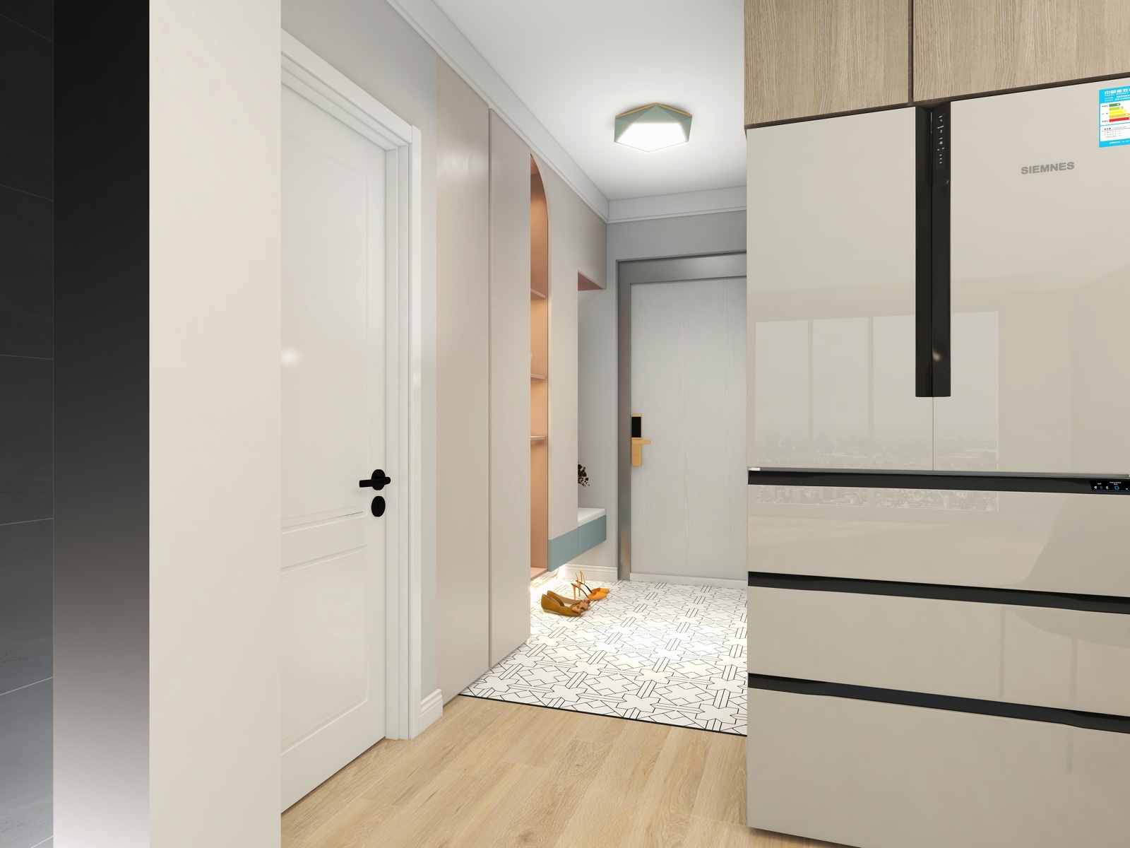 入戶門口地面選用小花磚,便于后期清理衛(wèi)生,鞋柜已改變傳統(tǒng)的格局,帶一點(diǎn)點(diǎn)造型空間。