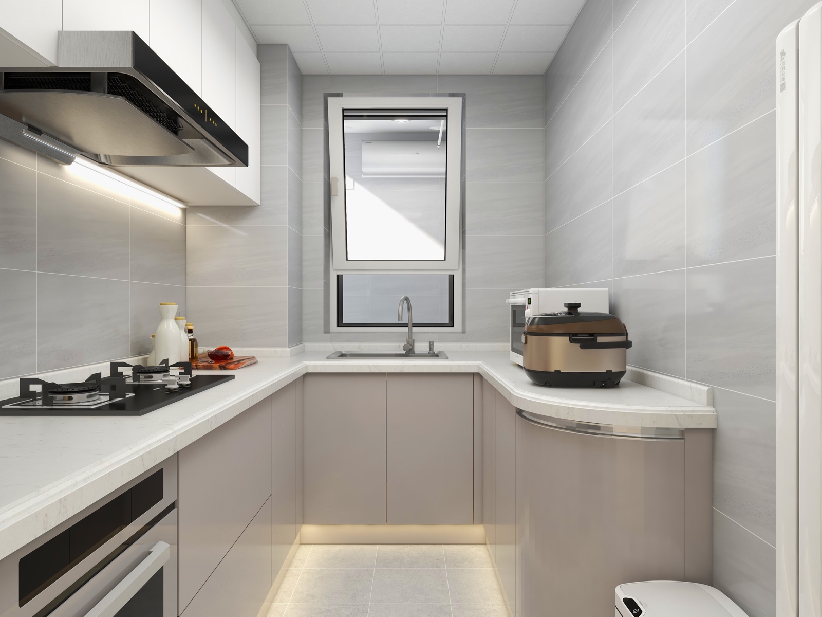 廚房設(shè)計(jì)成U型,增加儲(chǔ)物空間。