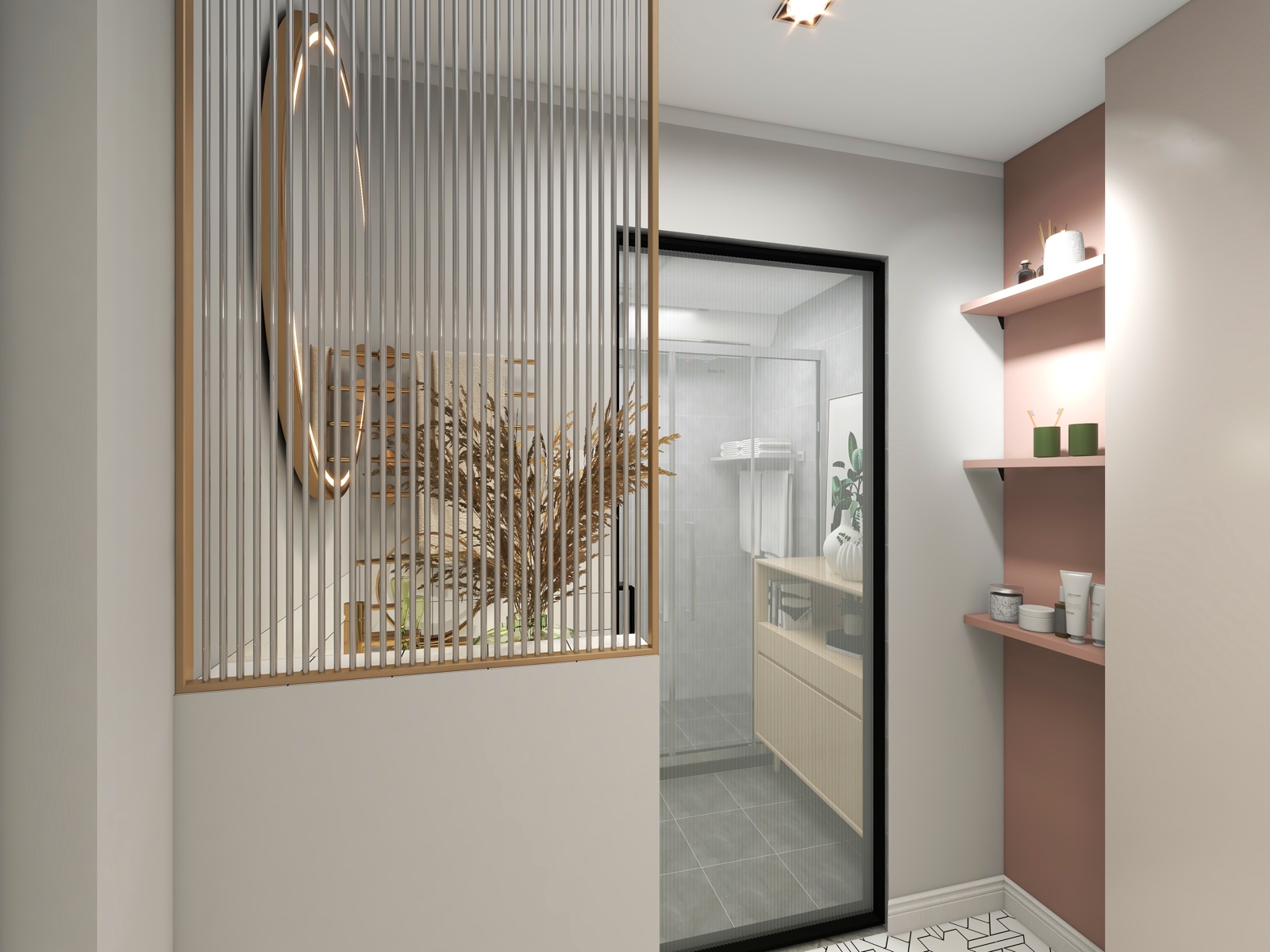 在臉盆對(duì)面利用包管道做個(gè)開放隔板,放一些點(diǎn)綴樣品。
