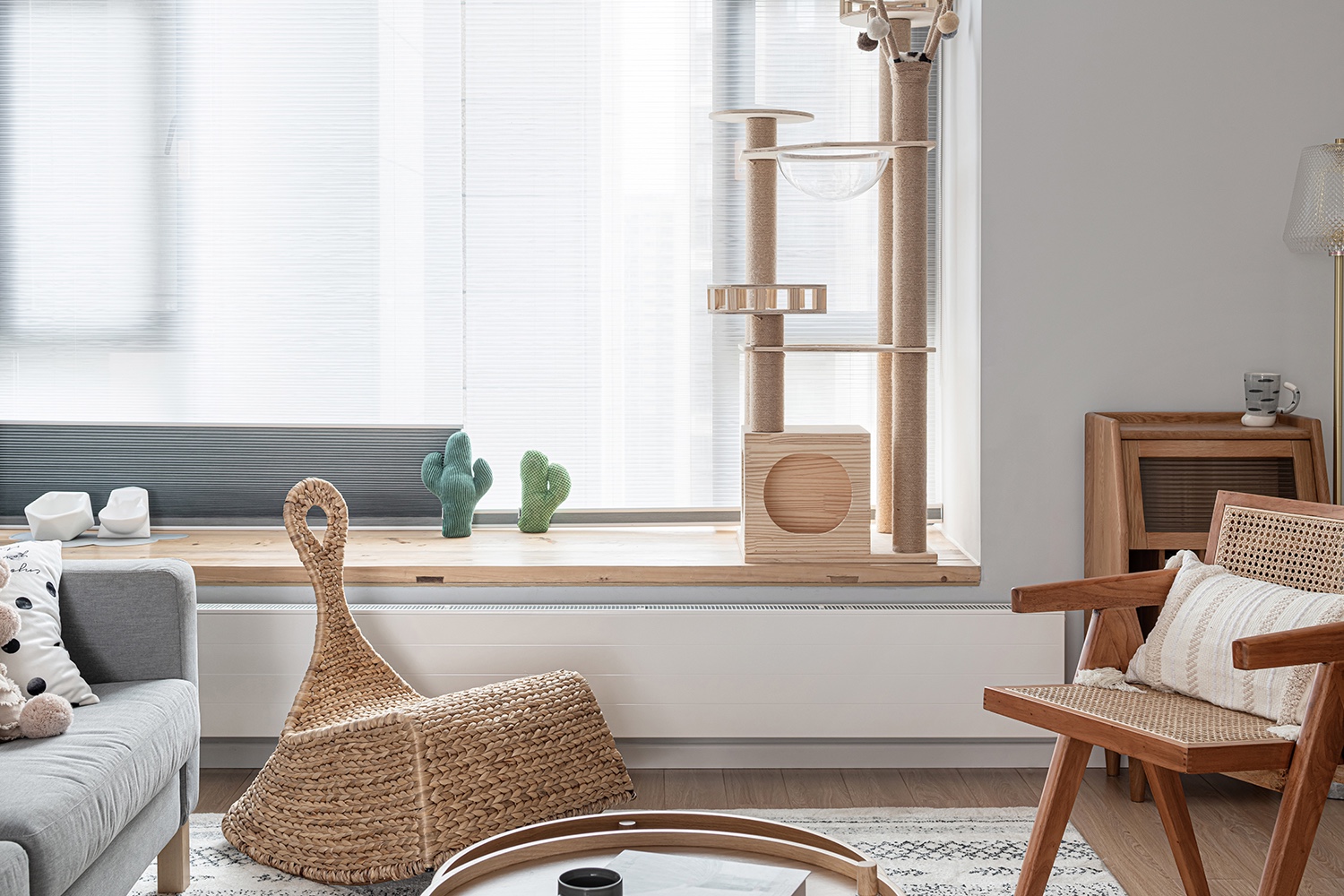 飄窗位置單獨設(shè)計一塊貓爬架,便于開窗通風,可以看見外面景色。