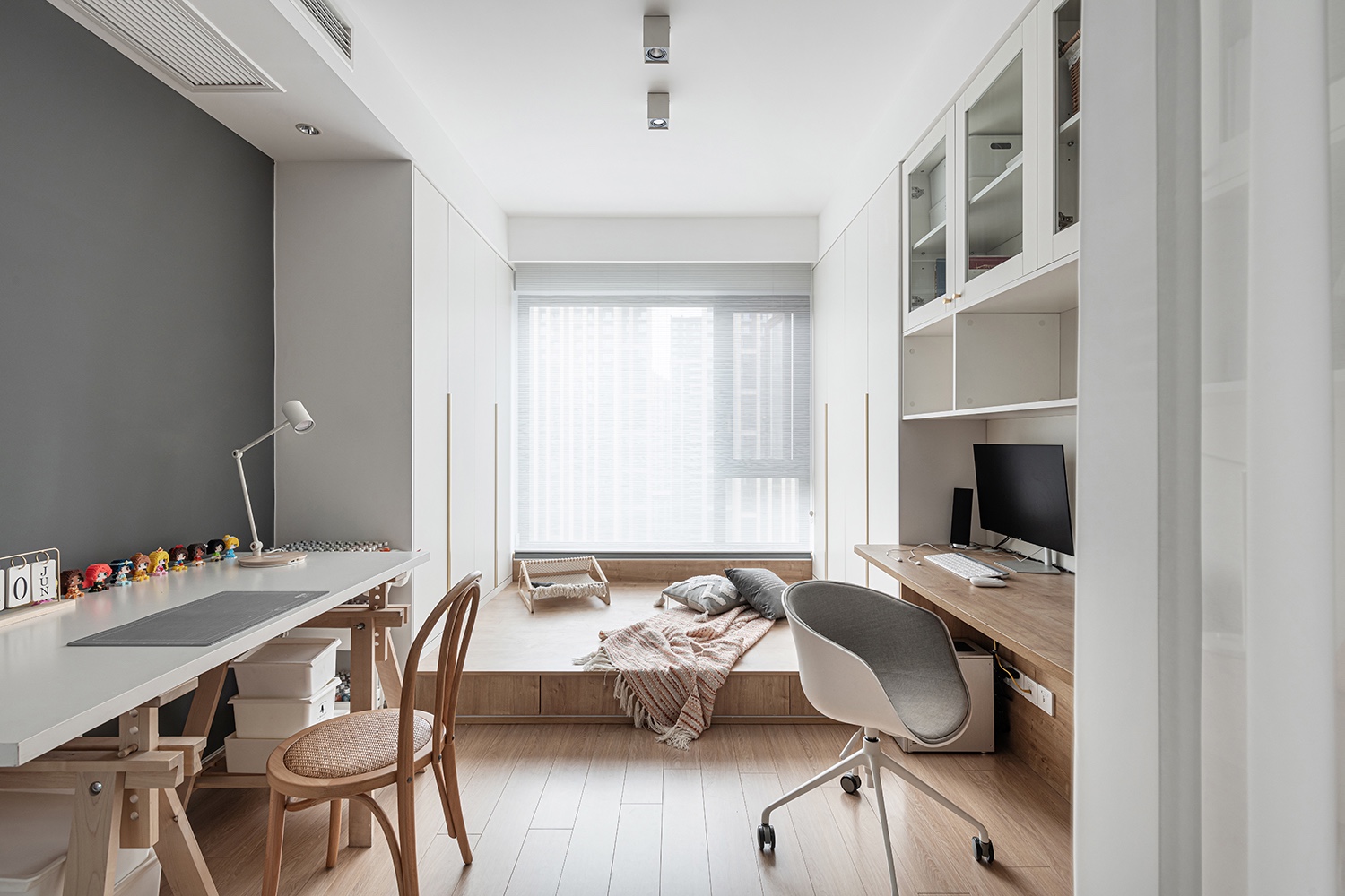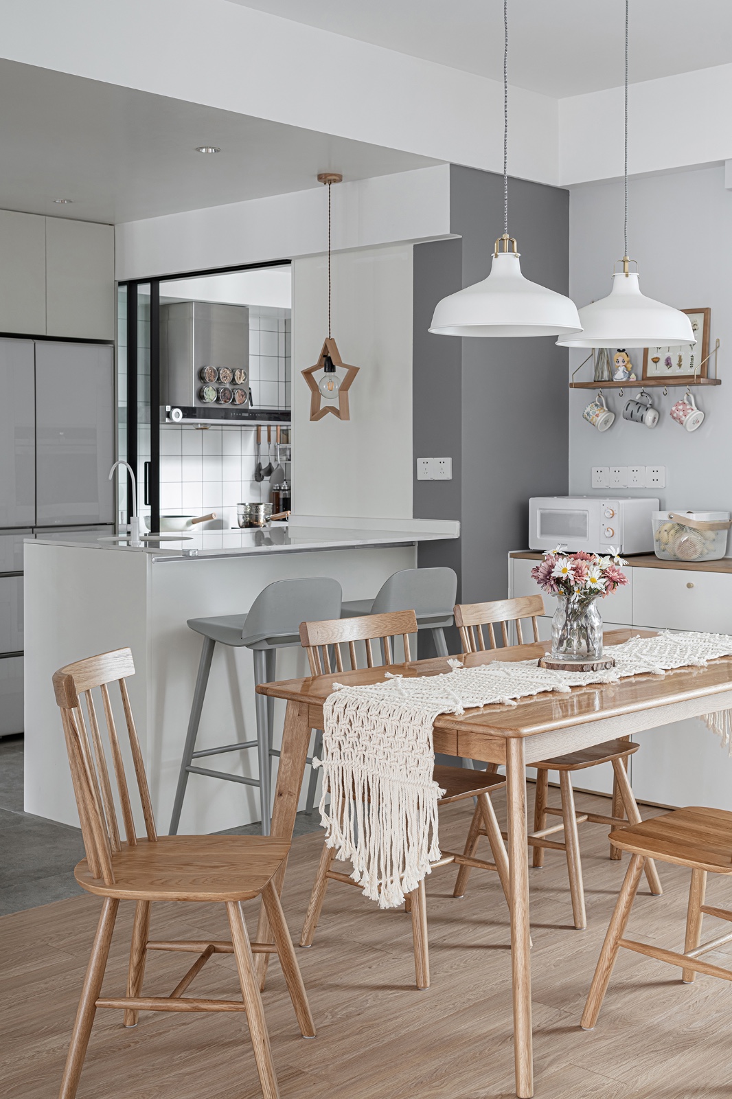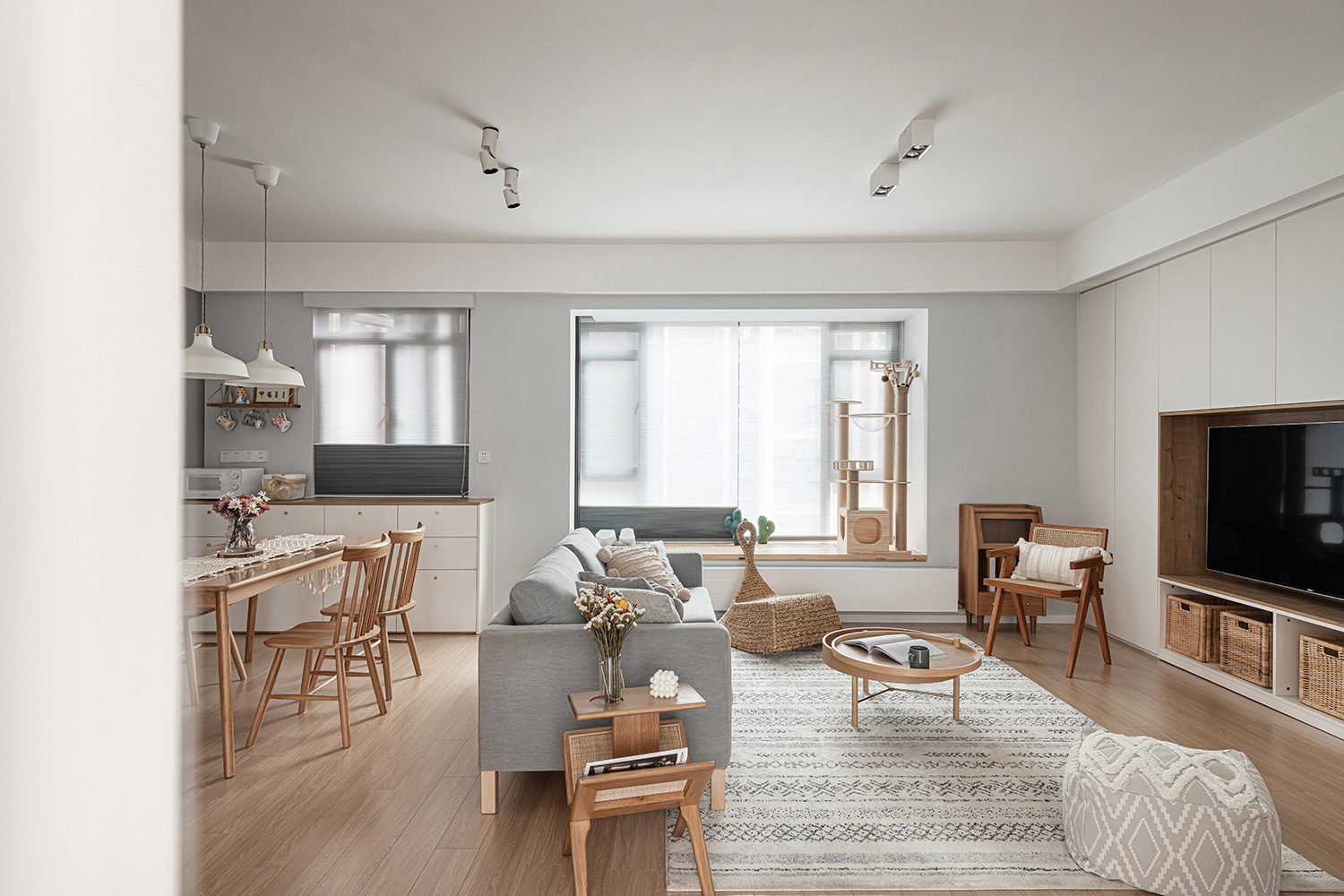 整體顏色為白色原木色為主,風格偏向北歐。