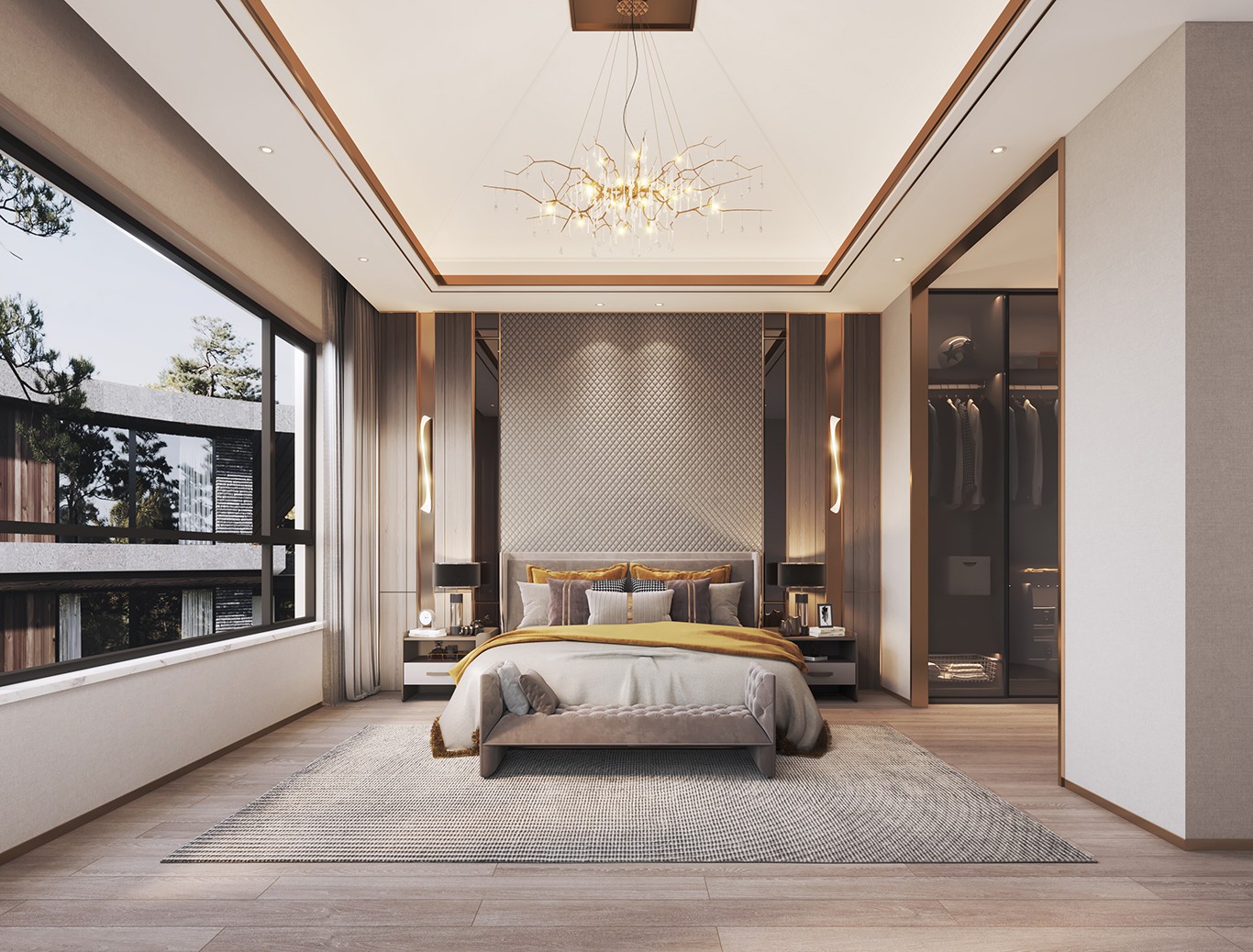 臥室內(nèi)的金屬彰顯奢華,溫馨的燈光使空間更具有家的定義