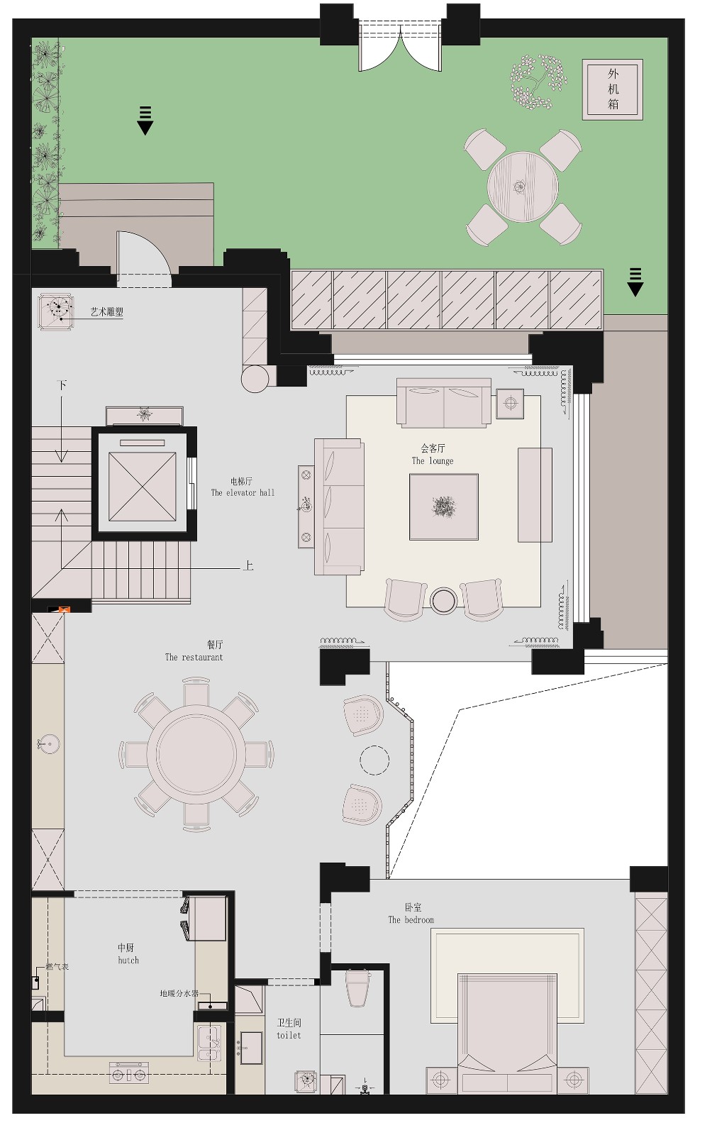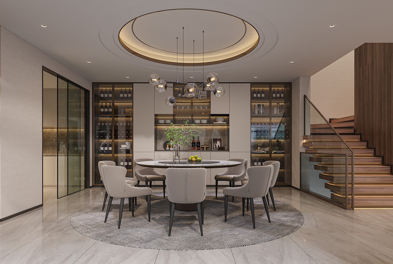 餐廳內(nèi)圓形吊頂與餐桌上下呼應