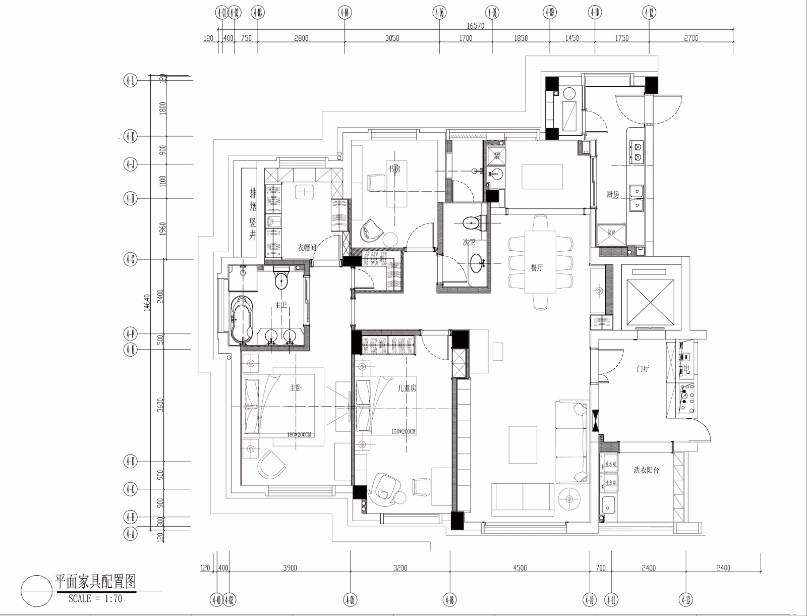 該戶型為大平層四居室但是后期保留2個(gè)臥室,其它空間改造成書房或者衣帽間。
