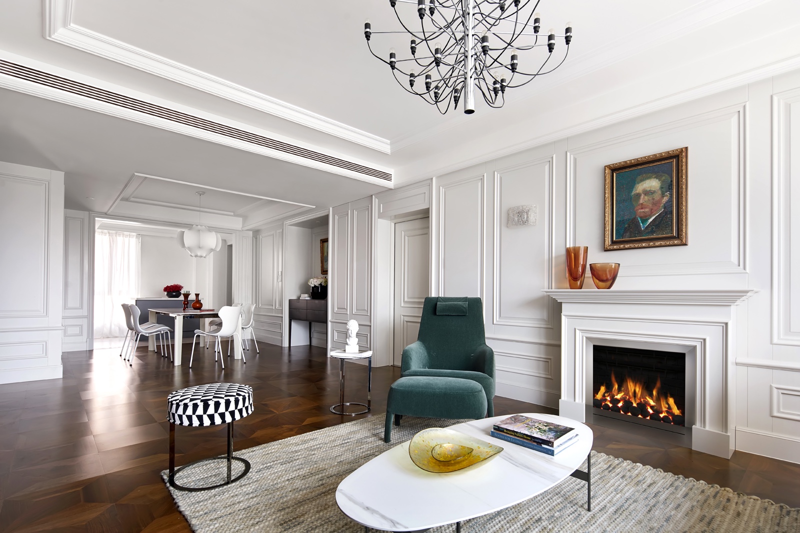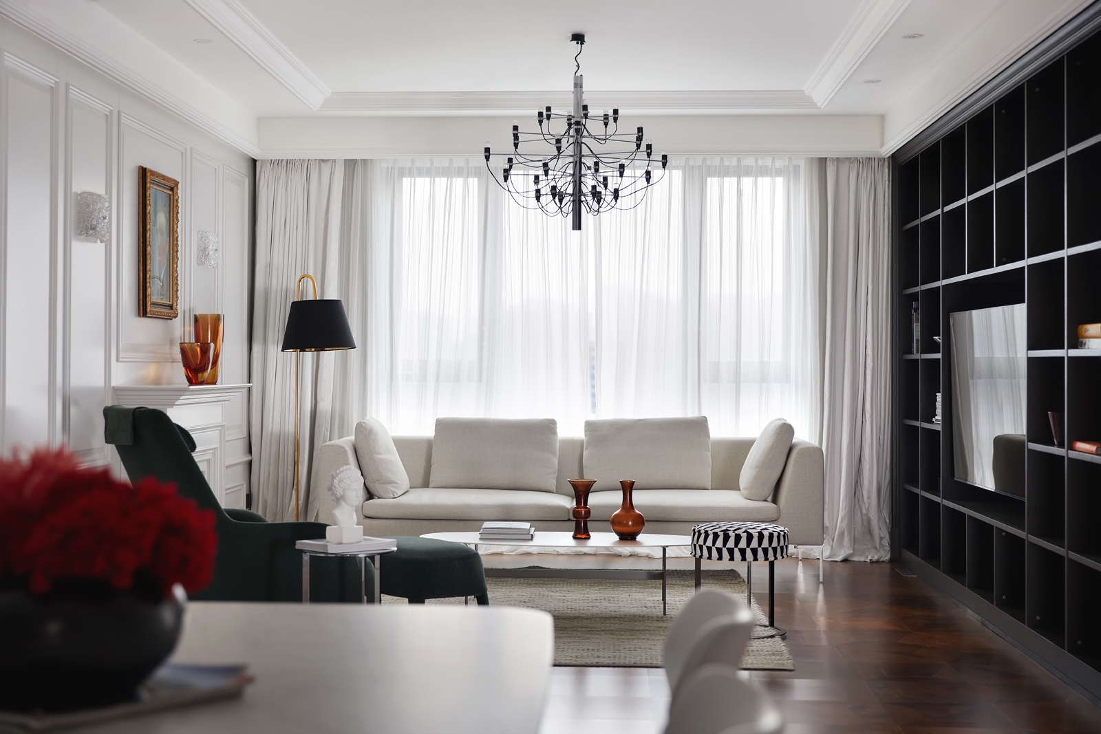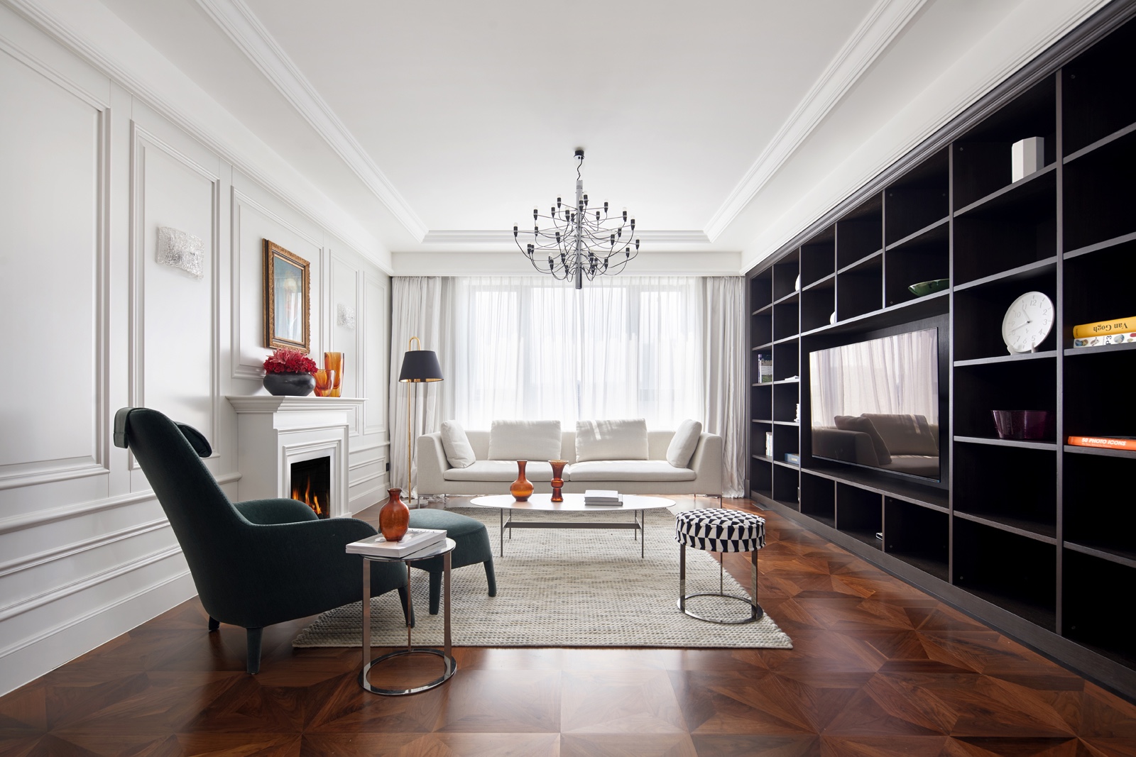 墻面的軟裝都是白色,柜子和地板為深色,對(duì)比更加突出。