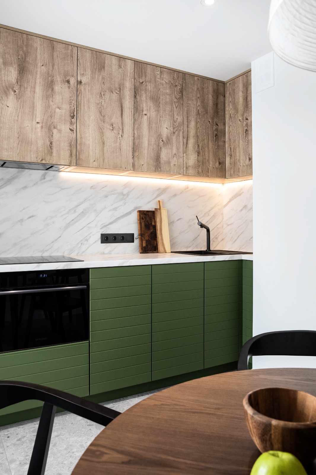 廚房采光特別好,櫥柜的搭配顏色與客廳色彩保持一致。