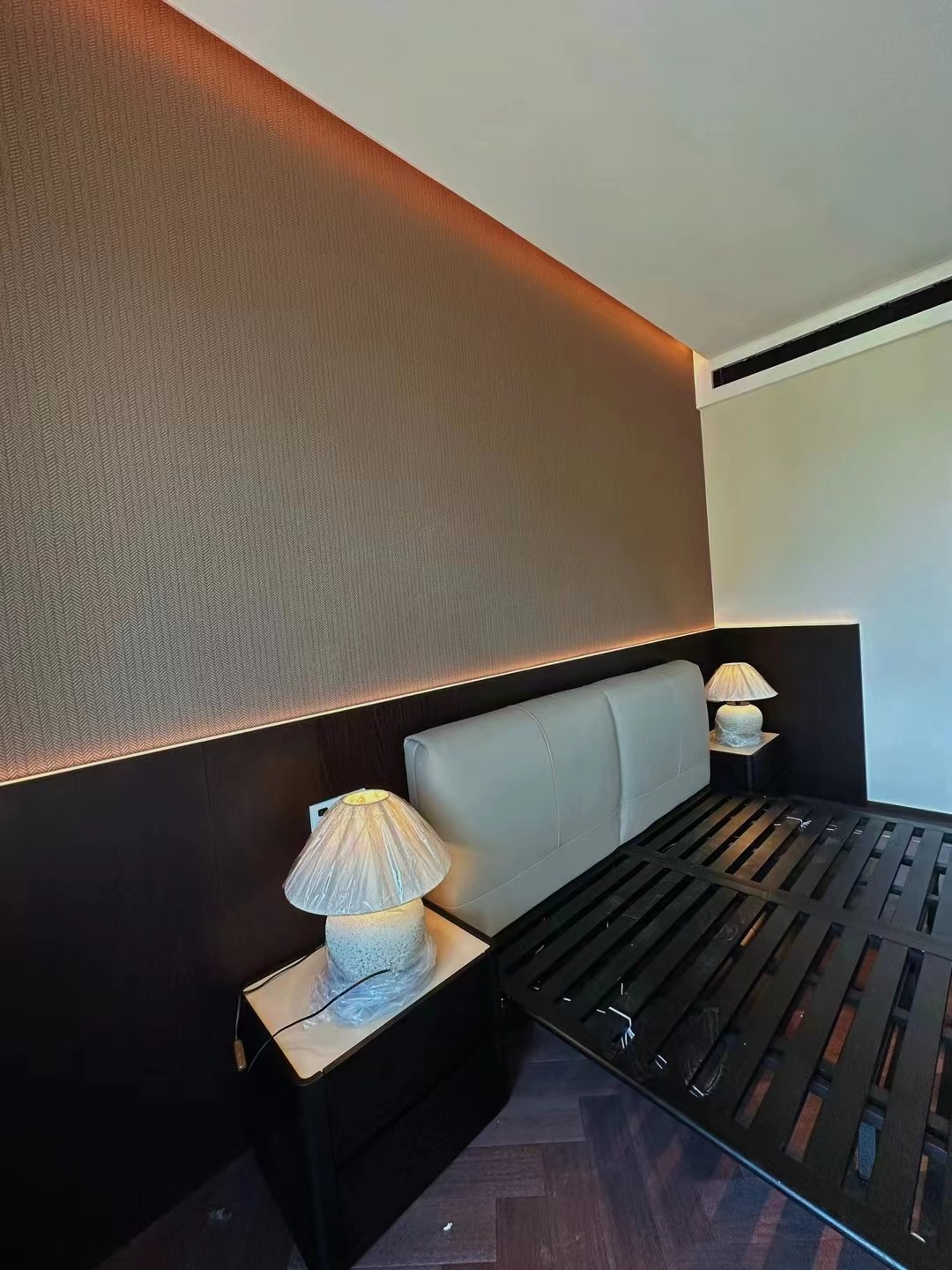 床頭隱藏?zé)魩г黾涌臻g的層次及氛圍,床頭壁布搭配富有生機(jī)的木質(zhì)肌理,讓臥室在簡(jiǎn)單的質(zhì)感中不缺精致感。