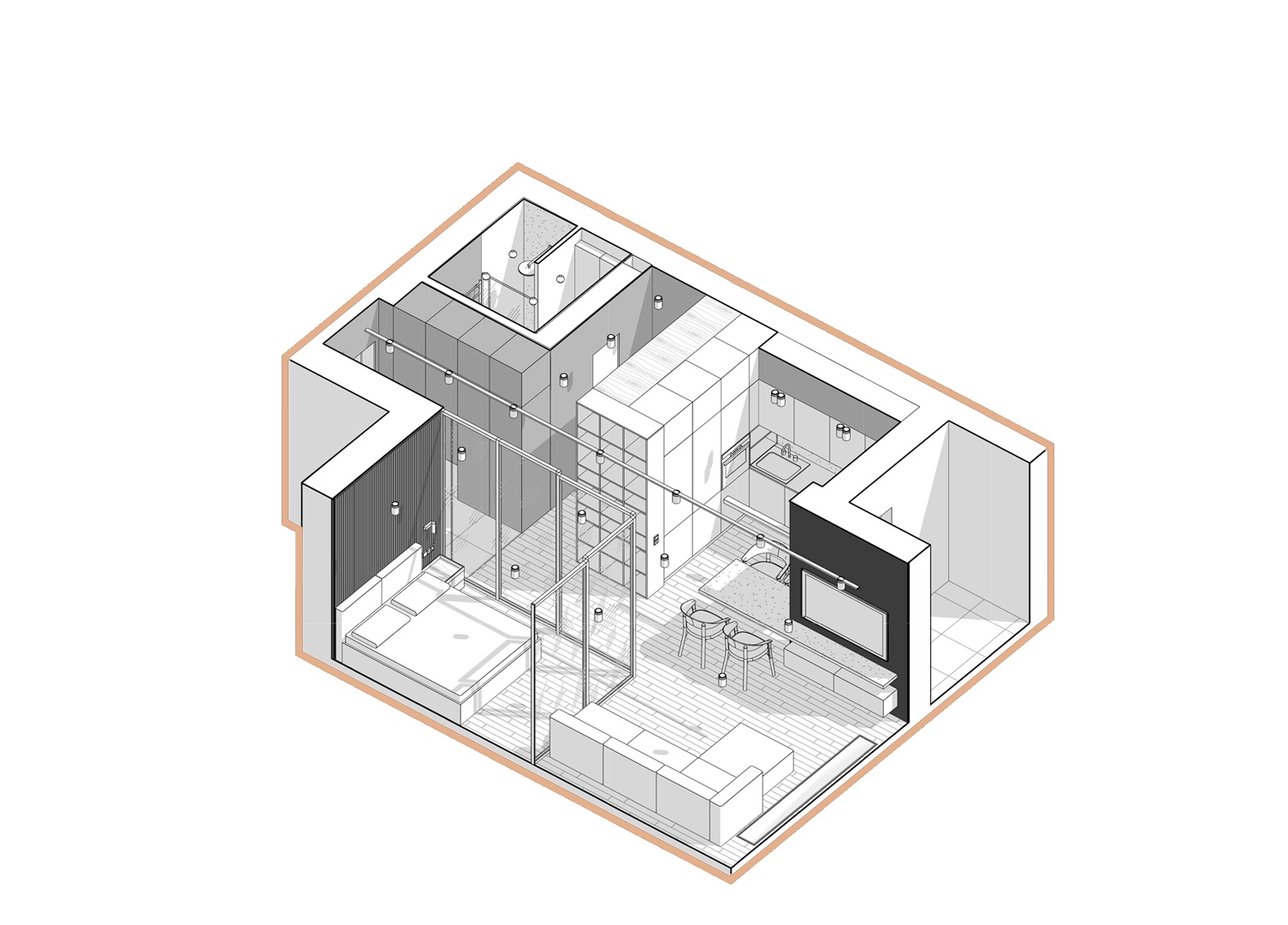 年輕人購買的一居室公寓,面積雖然不大但是各個功能區(qū)還是必須保留。