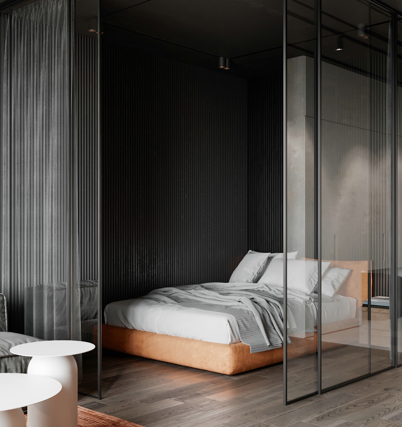 臥室采用玻璃推拉門的軟隔斷來區(qū)分功能區(qū),臥室整體顏色采用深色木有很好的睡眠效果。