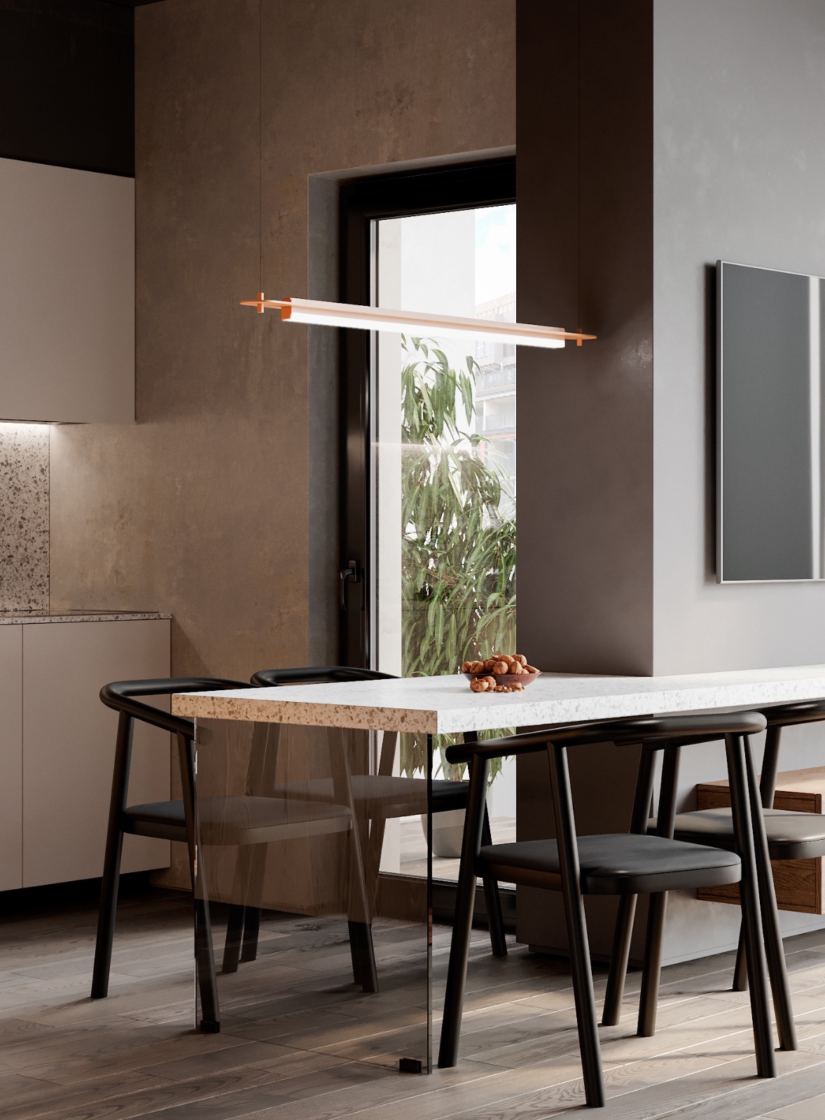 餐桌利用電視背景墻做一個延伸,整體比例更加協(xié)調(diào)。