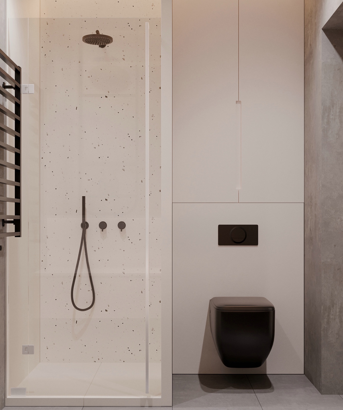 衛(wèi)浴的花灑采用預(yù)埋式的,馬桶采用壁掛隱藏式的,看起來更整潔干凈。