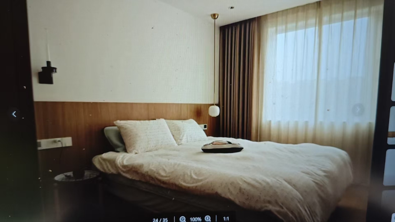 主臥床頭用了很巧妙的“地板上墻”設(shè)計(jì),看起來簡(jiǎn)潔大方,讓墻面和地面風(fēng)格更統(tǒng)一,視覺上更顯整體。而且這樣設(shè)計(jì)還有個(gè)好處,能給床尾過道留出更寬的空間,走路不擁擠。床頭兩邊裝了不對(duì)稱的床頭燈,一高一低、一左一右,打破了單調(diào)感,為臥室增添了幾分活潑的氛圍,讓整個(gè)空間不顯沉悶。