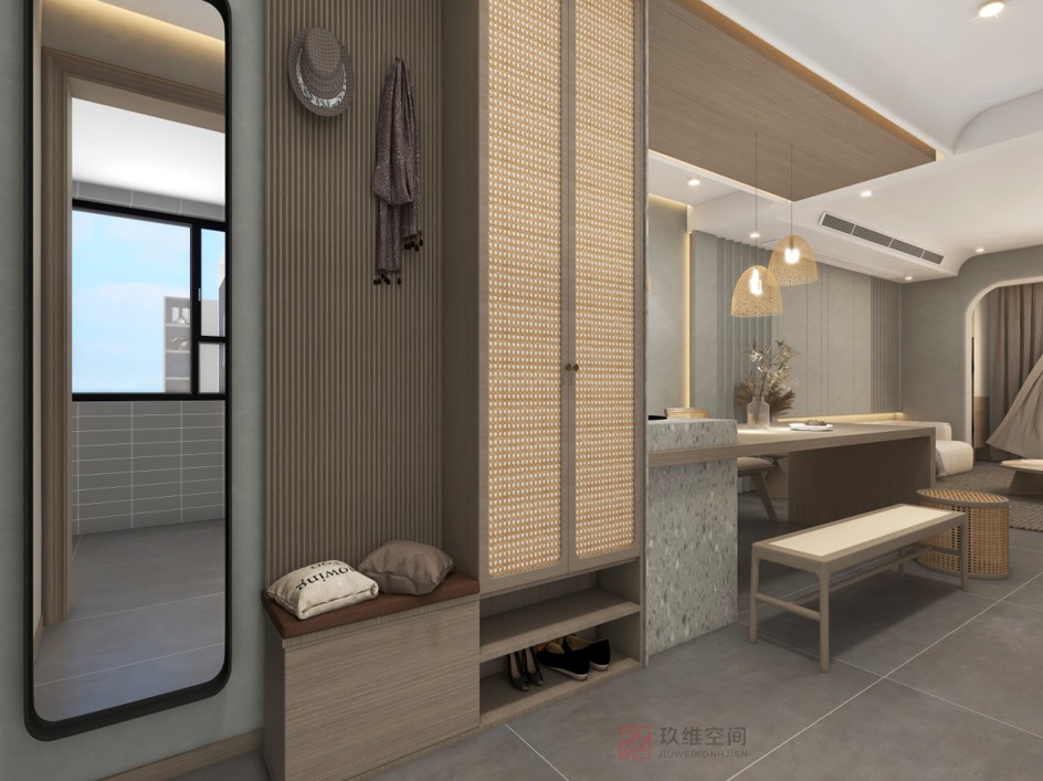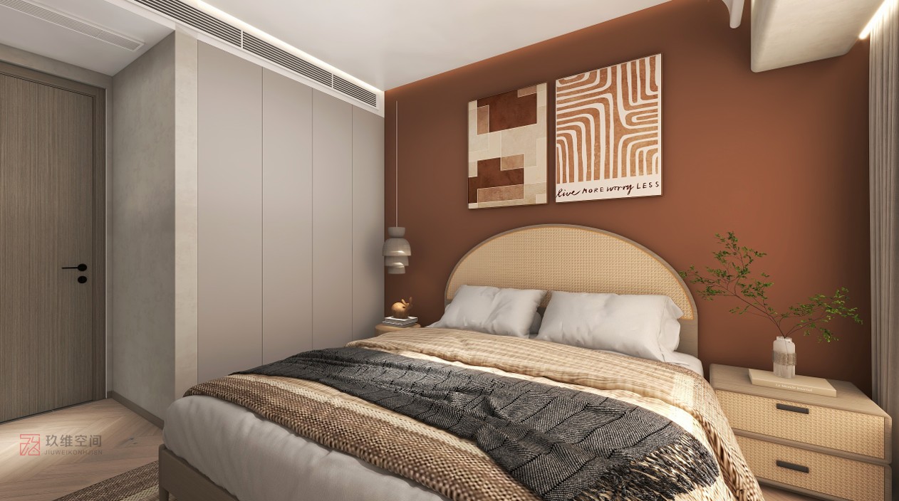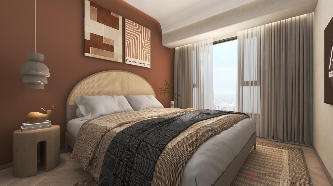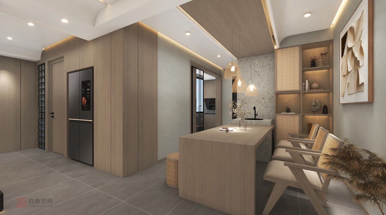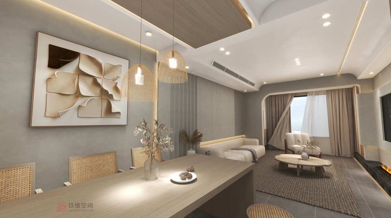 侘是簡(jiǎn)潔安靜中融入質(zhì)樸的美,寂是時(shí)光流逝的光澤。以中性色調(diào)為主,肌理感的藝術(shù)涂料,陶土、藤編和具有禪意的木器,手工制品的質(zhì)感與肌理將感知放大,細(xì)膩的微妙觸感回歸到淳樸的手作時(shí)代在接觸的剎那喚醒內(nèi)心的溫柔。
