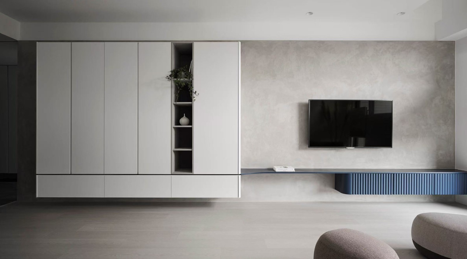 客廳電視墻以淺色為基底,構(gòu)建溫潤(rùn)、輕盈的氛圍;局部金屬材質(zhì)點(diǎn)染,形成如東方畫(huà)面般的光影層次。