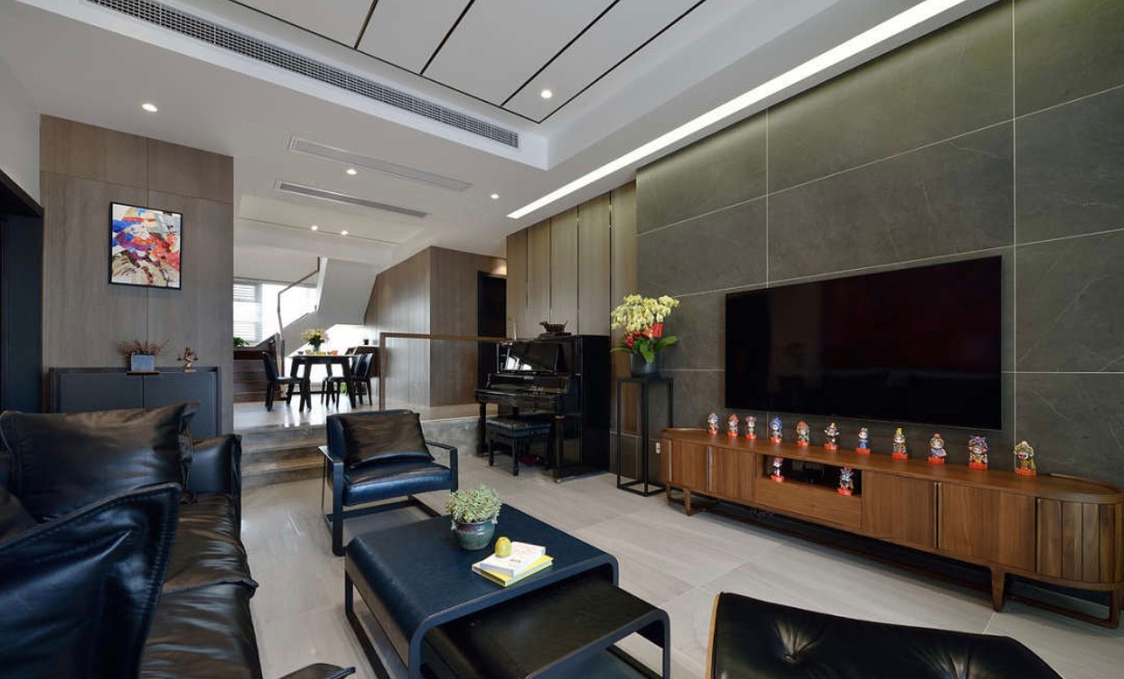 新中式客廳貴在刪繁就簡,設(shè)計以方為主,方正的頂面設(shè)計與天然材料的互補(bǔ)。