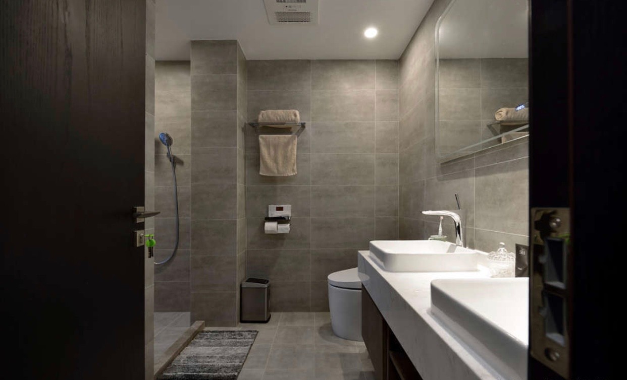 衛(wèi)生間面積很大,地面鋪貼與客廳同款的瓷磚。