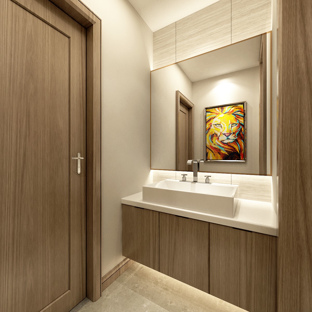 本案運(yùn)用仿天然大理石瓷磚、深木色原木及皮革等自然材質(zhì)