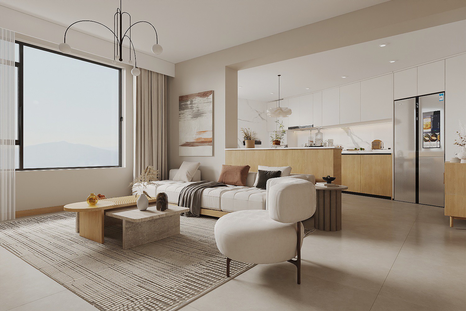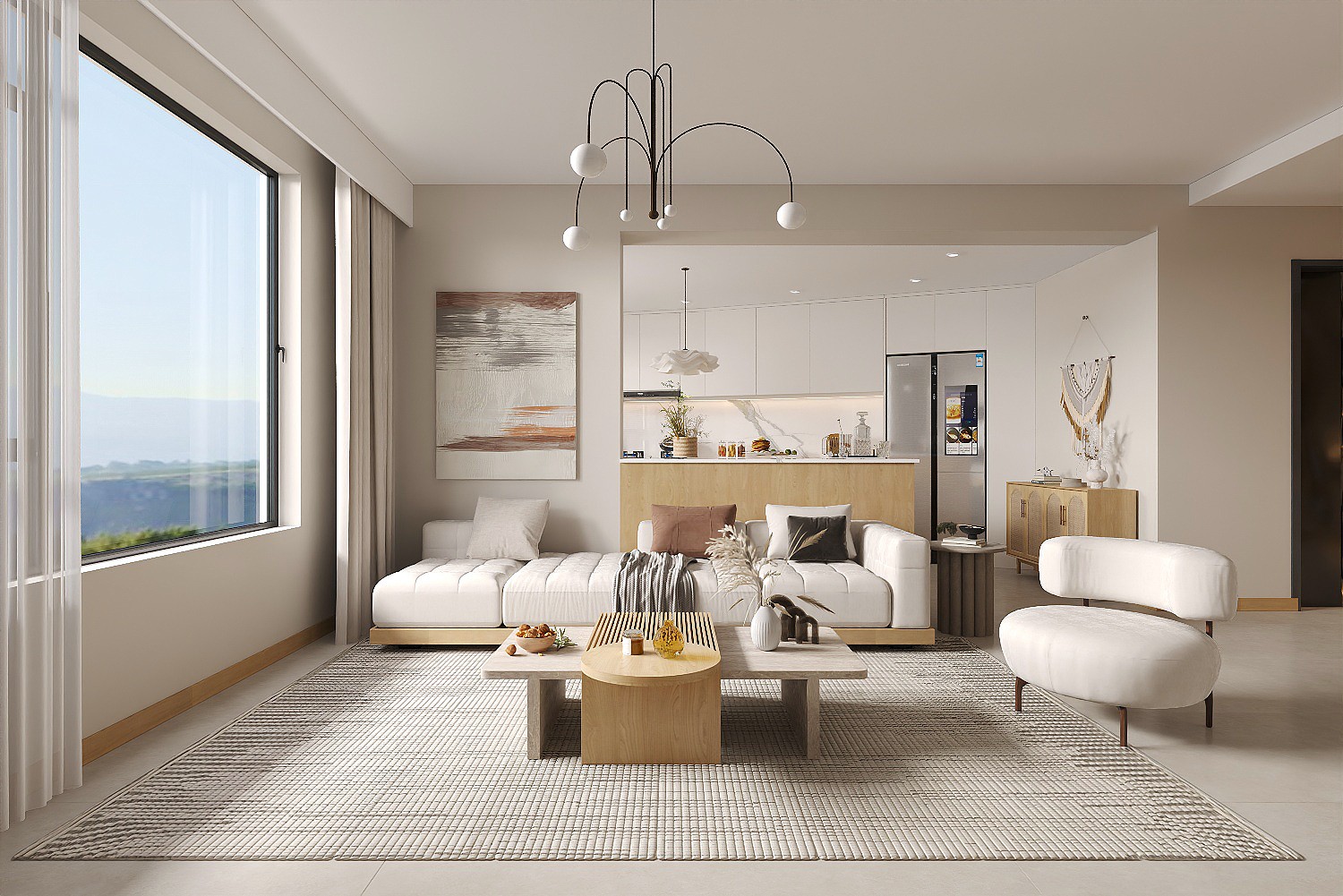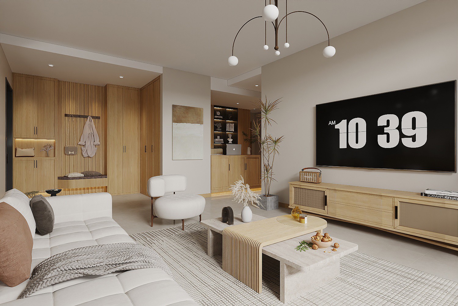 整體搭配淺色地磚,白色的墻面及天花,搭配設(shè)計感電視柜和茶幾,非常特別。