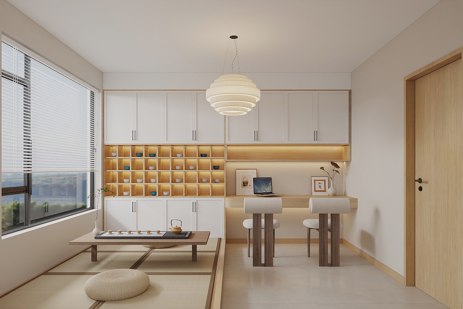 結(jié)合業(yè)主現(xiàn)在情況和時間的延長,次臥做了休閑地臺,喝茶休憩,來客人還可以當(dāng)成客房,超大工作臺滿足男女業(yè)主的工作學(xué)習(xí)需求,女兒很多的盲盒公仔,書架也給出了超大空間。