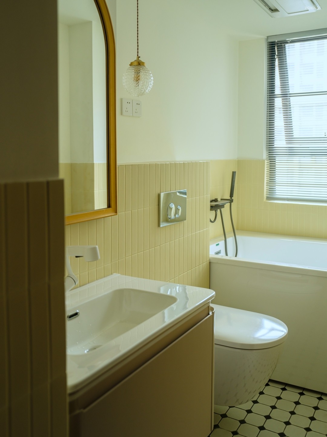 衛(wèi)生間淡黃色小條磚,地面點(diǎn)狀方格磚,延續(xù)了整體公共空間的復(fù)古和溫馨。
