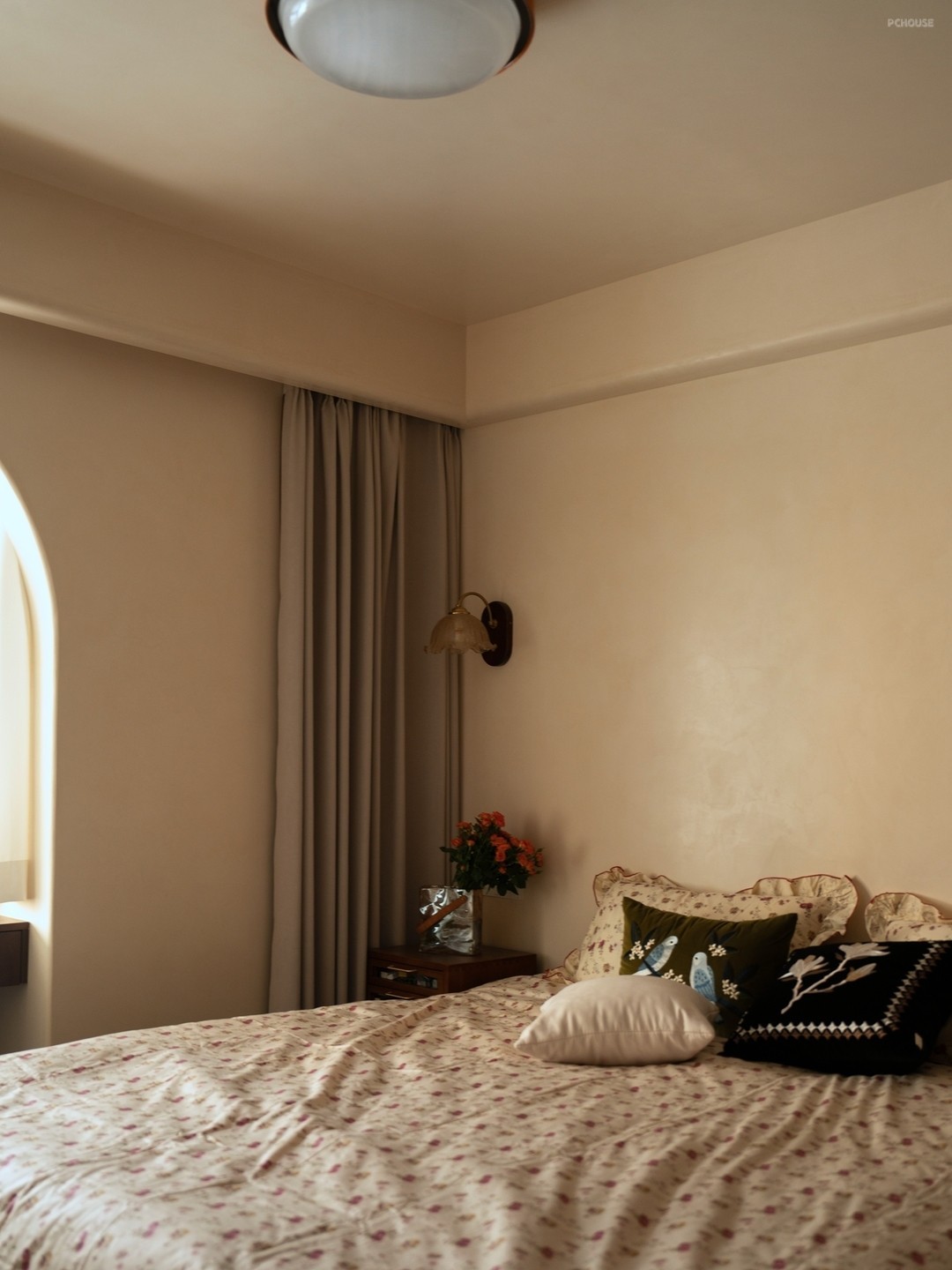睡眠區(qū)的布置簡(jiǎn)單利落,沒有多余的裝飾,墻頂面采用藝術(shù)漆滿刷增加復(fù)古感。復(fù)古是一種生活品味與態(tài)度,更是一種與時(shí)間對(duì)話的方式。